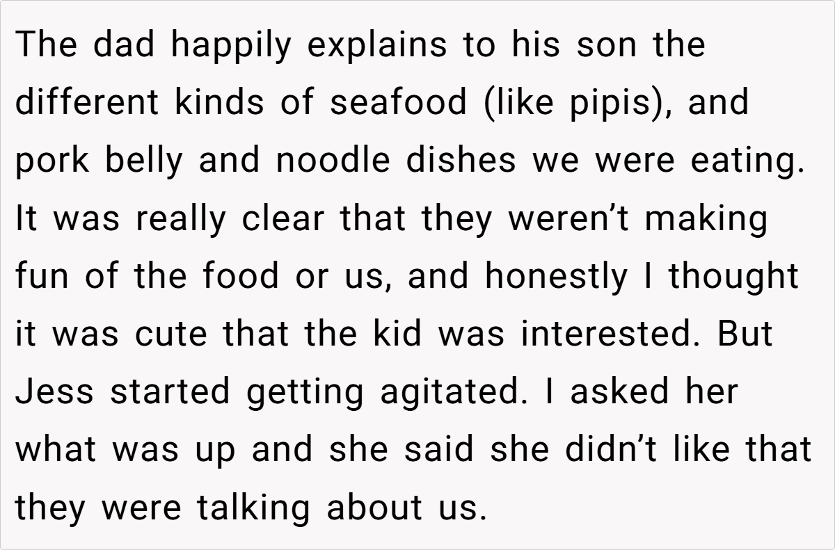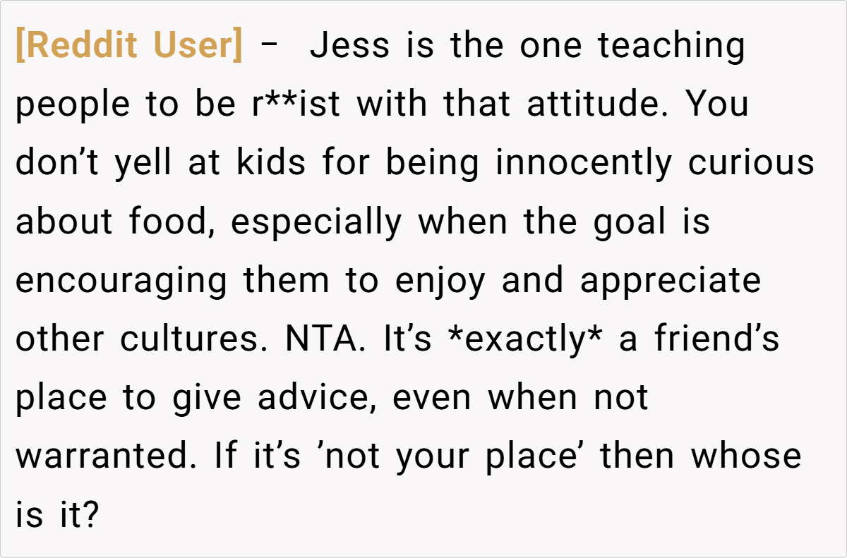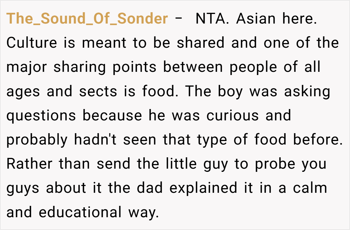 In a general overview, the Reddit community largely supported the notion that the father and his son were engaging in innocent cultural exchange. Most commenters agreed that the dinner incident was misinterpreted by Jess, whose past trauma clearly influences her reactions. Many felt that while her pain is valid, suggesting professional help was a caring, if ill-timed, intervention. The consensus stressed the importance of empathy and proactive mental health support in such delicate situations.