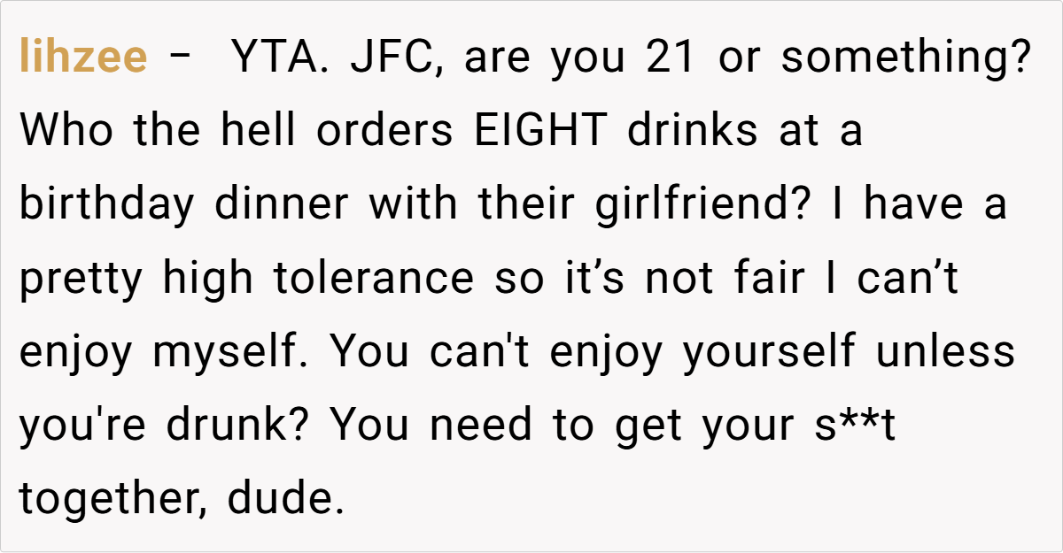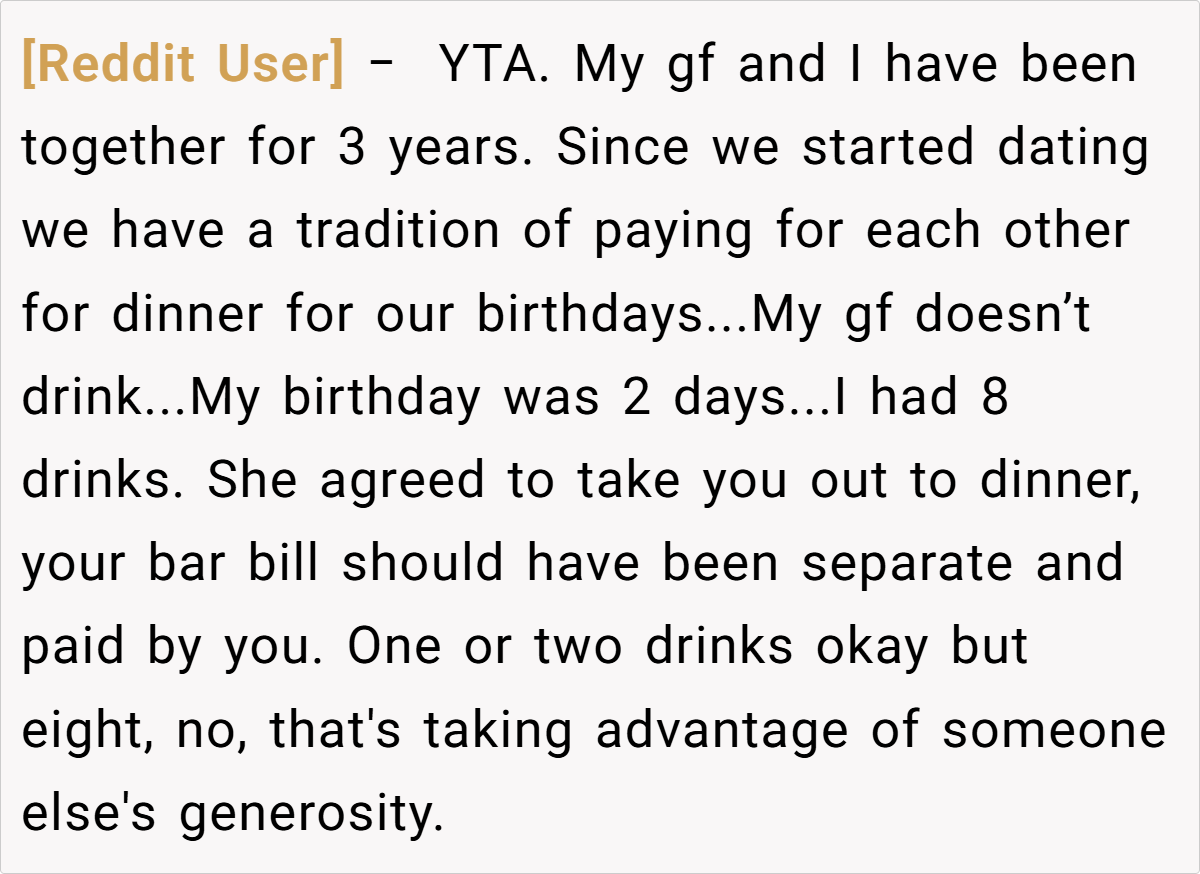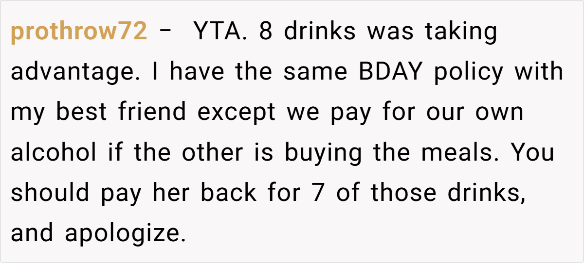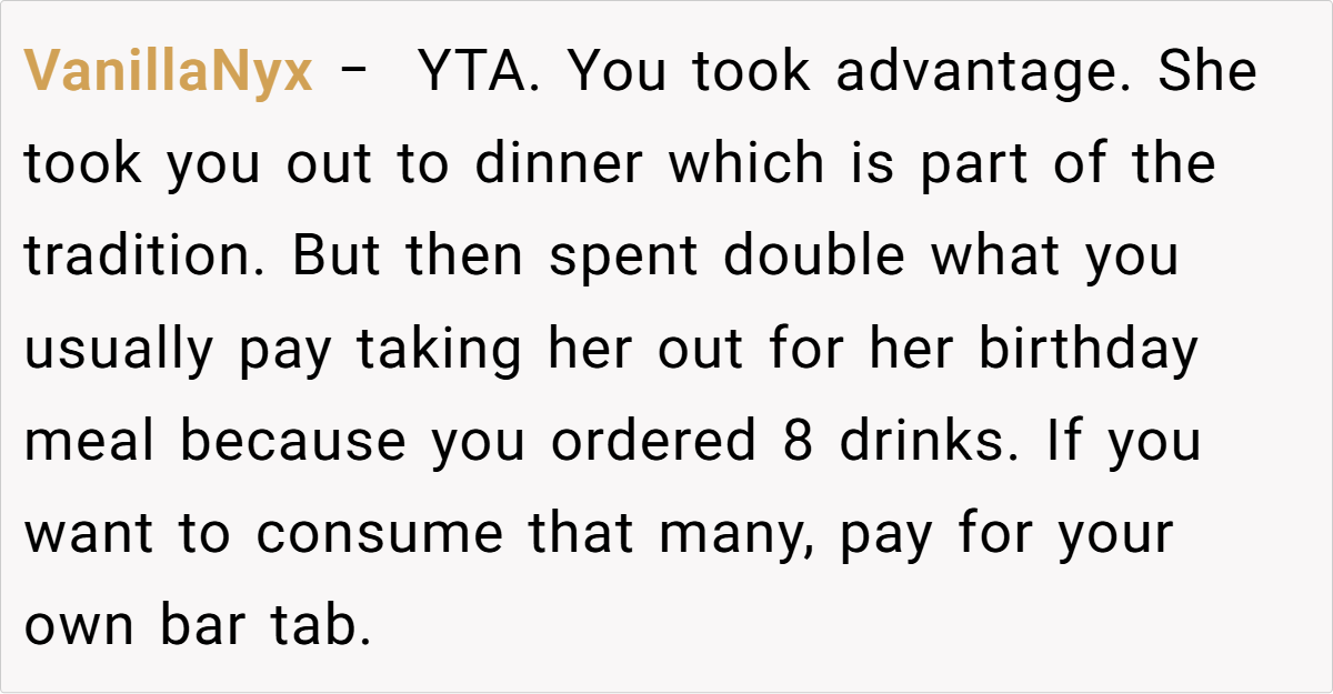 In this case, the tradition of paying for each other’s birthday meals was meant to celebrate and share a special moment. However, ordering eight drinks—far beyond what is typically expected—disrupts that balance and signals a disregard for the mutual agreement.