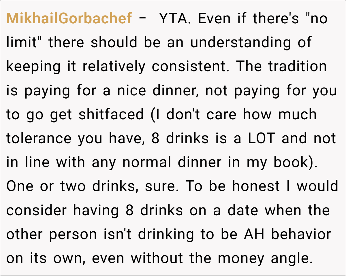 Commenters point out that if one party chooses to indulge excessively—especially in a way that disrupts the agreed-upon split—they should cover those extra costs themselves. The consensus is clear: pushing the envelope in this way is seen as taking unfair advantage of the other’s generosity, and it reflects a broader issue of mismatched expectations regarding spending and personal responsibility.