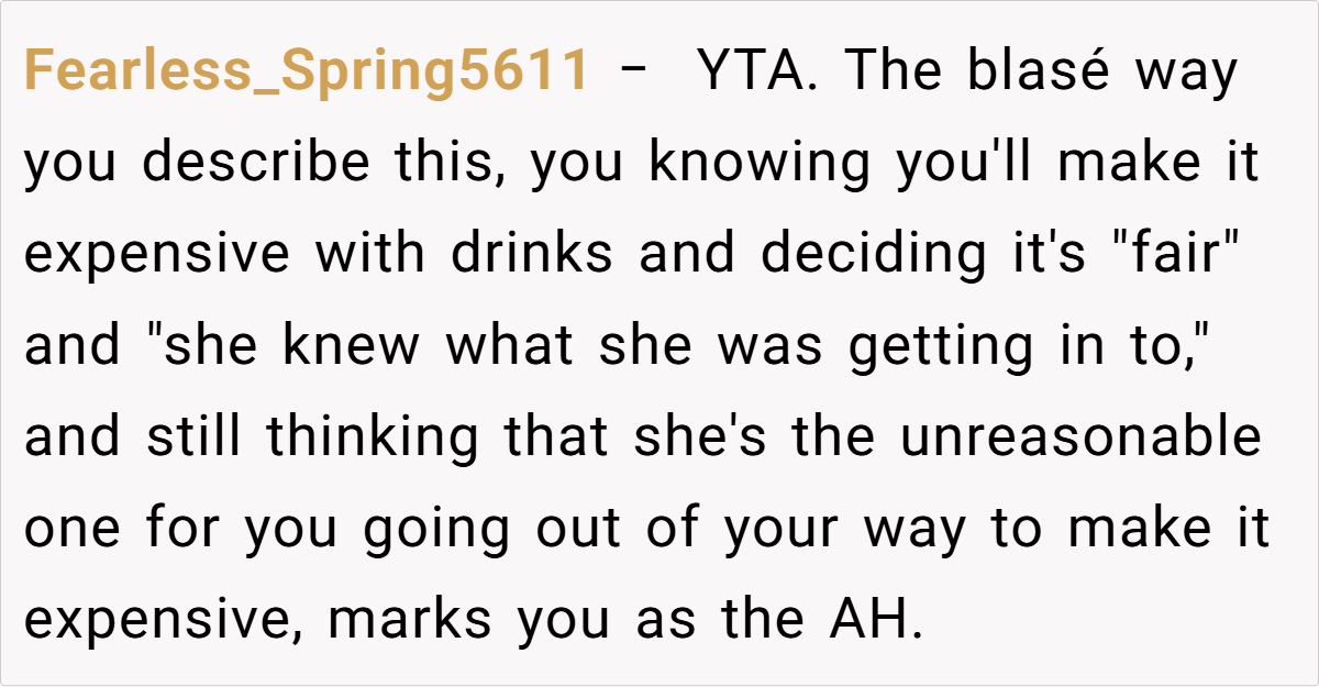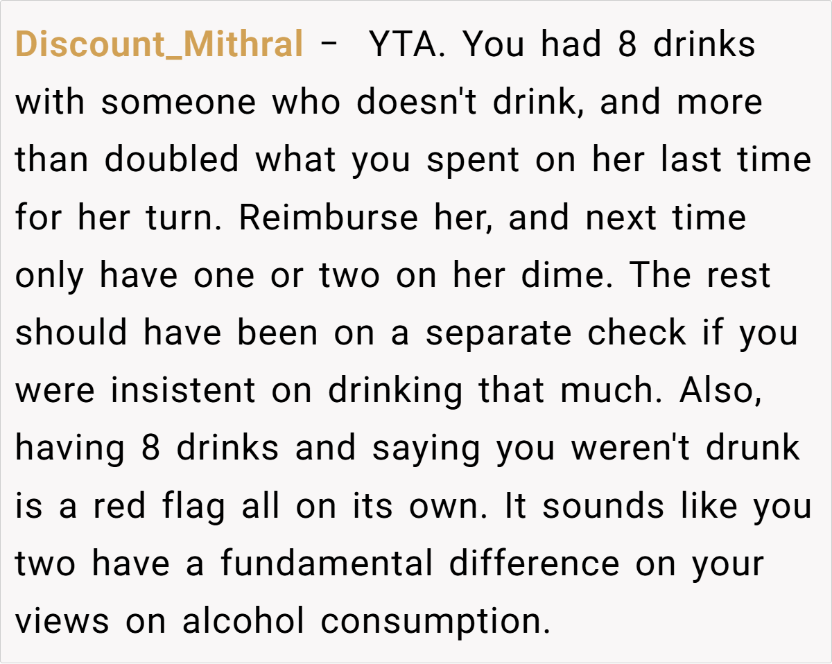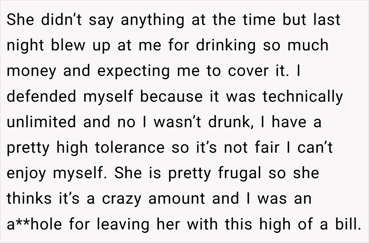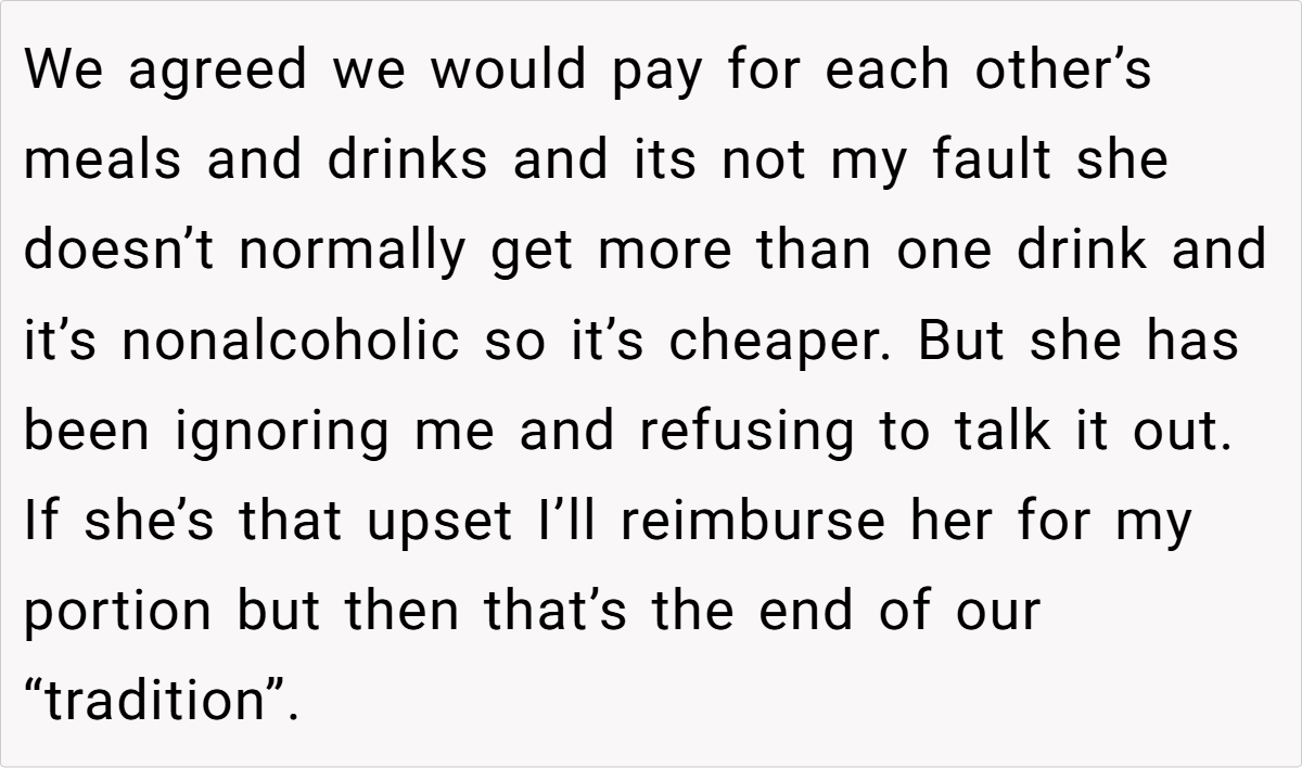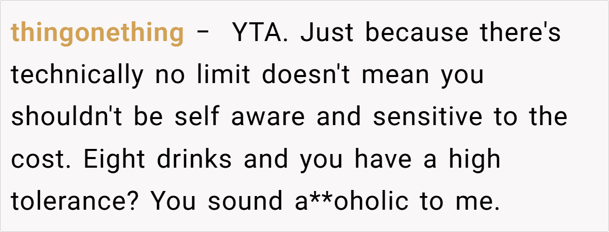 Ultimately, this incident is not merely about a higher-than-usual bar tab—it’s about respecting the spirit of a shared tradition and the boundaries that come with it. The disagreement serves as a reminder that clear communication and fairness are vital, especially when personal indulgences might disrupt a mutual understanding.