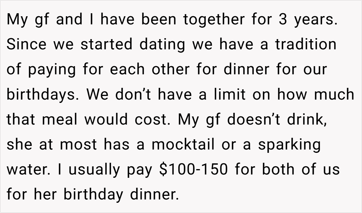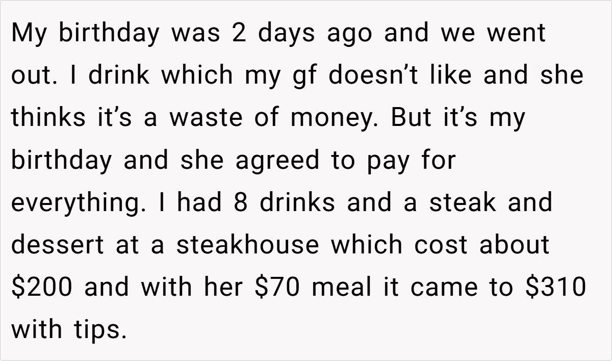 Celebrations often come with traditions that strengthen the bond between couples, but sometimes, the unspoken rules can get blurred. In this case, a long-standing birthday dinner tradition turned sour when one partner took the opportunity to significantly overindulge—ordering eight drinks on a night meant to be shared. While the tradition was to split the bill for a mutually enjoyed meal, the imbalance in spending quickly sparked a heated debate about fairness and respect for agreed-upon boundaries.