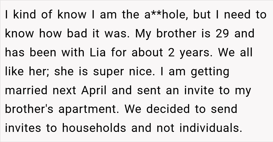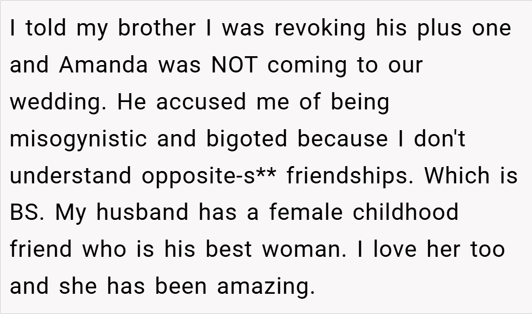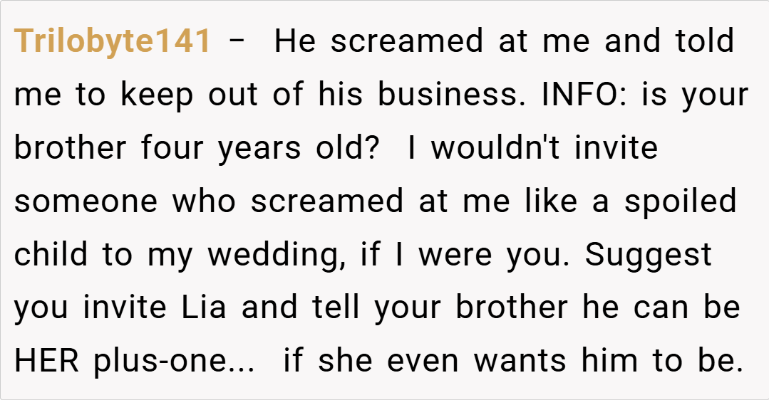 Ultimately, the OP’s decision to revoke her brother’s plus one and insist on inviting someone she trusts reflects a strong commitment to her wedding’s integrity. While her brother views her actions as an overreaction, it’s clear that her boundary-setting was driven by the need to avoid unnecessary drama and ensure that her celebration remained true to her vision.