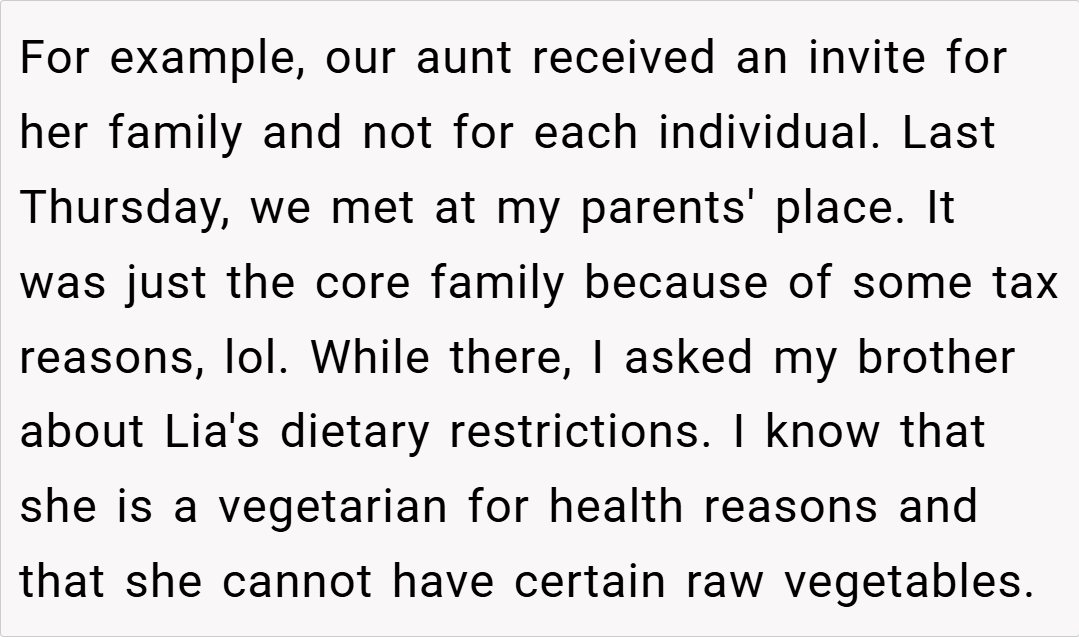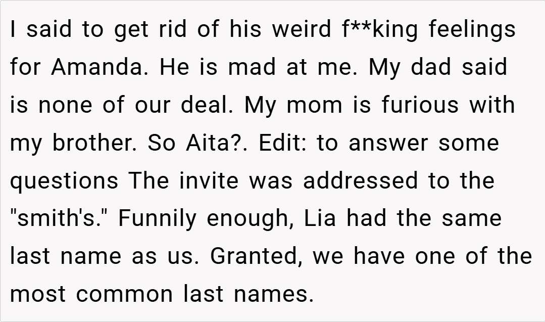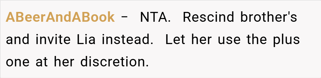 Moreover, research in family dynamics shows that clear, upfront communication about guest expectations can prevent conflicts from snowballing. In this instance, the OP’s decision might have been less hurtful if her brother had been given the opportunity to choose a guest who aligned with the family’s values.