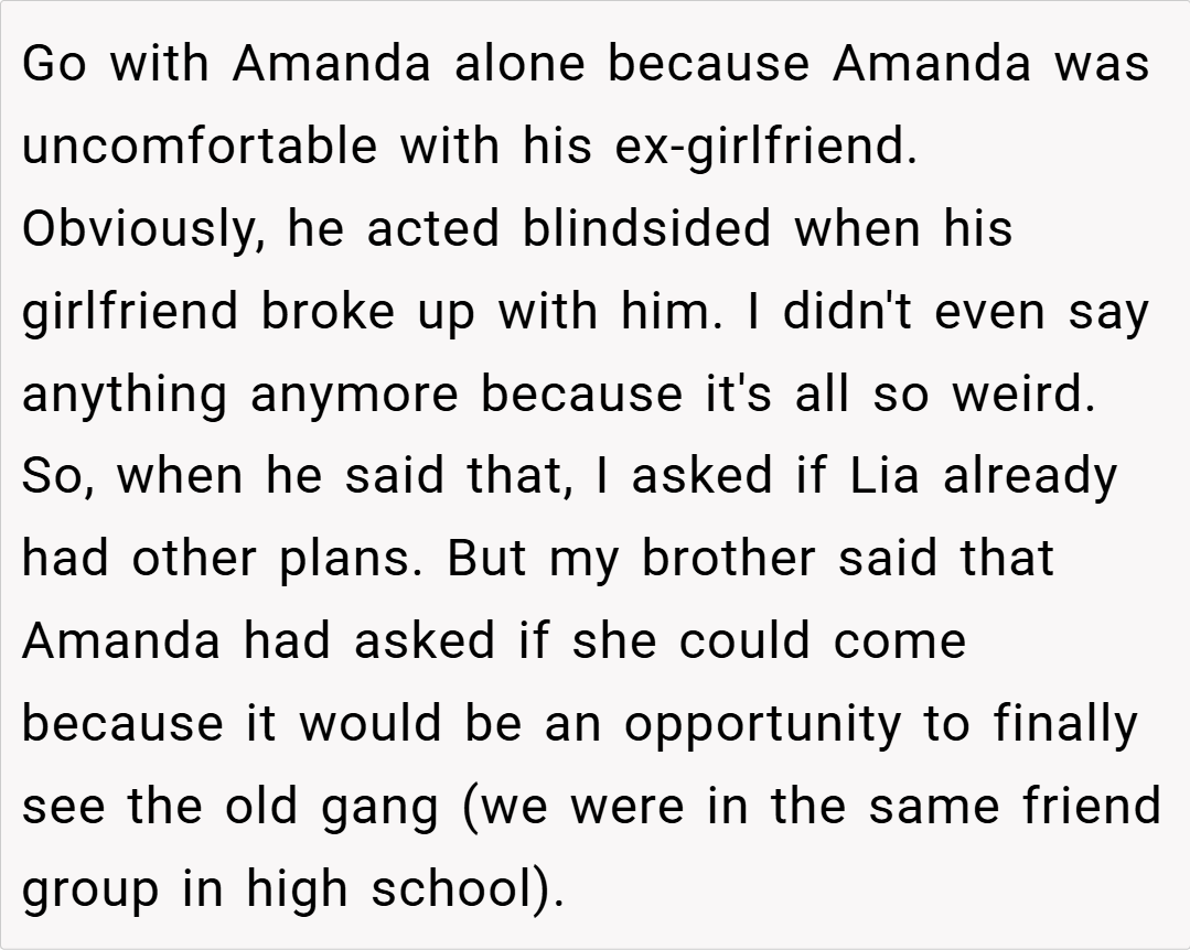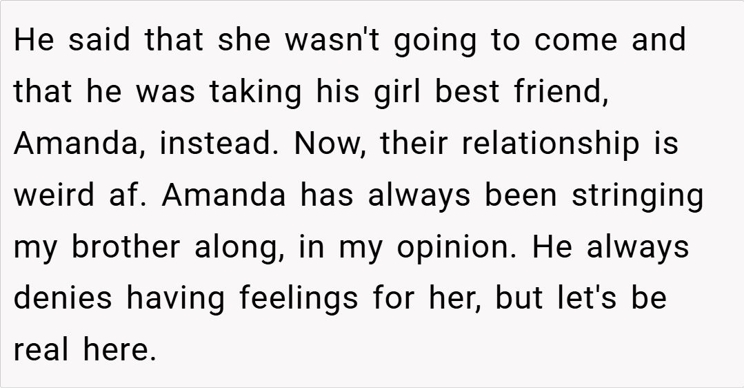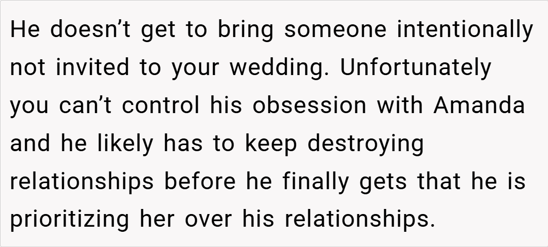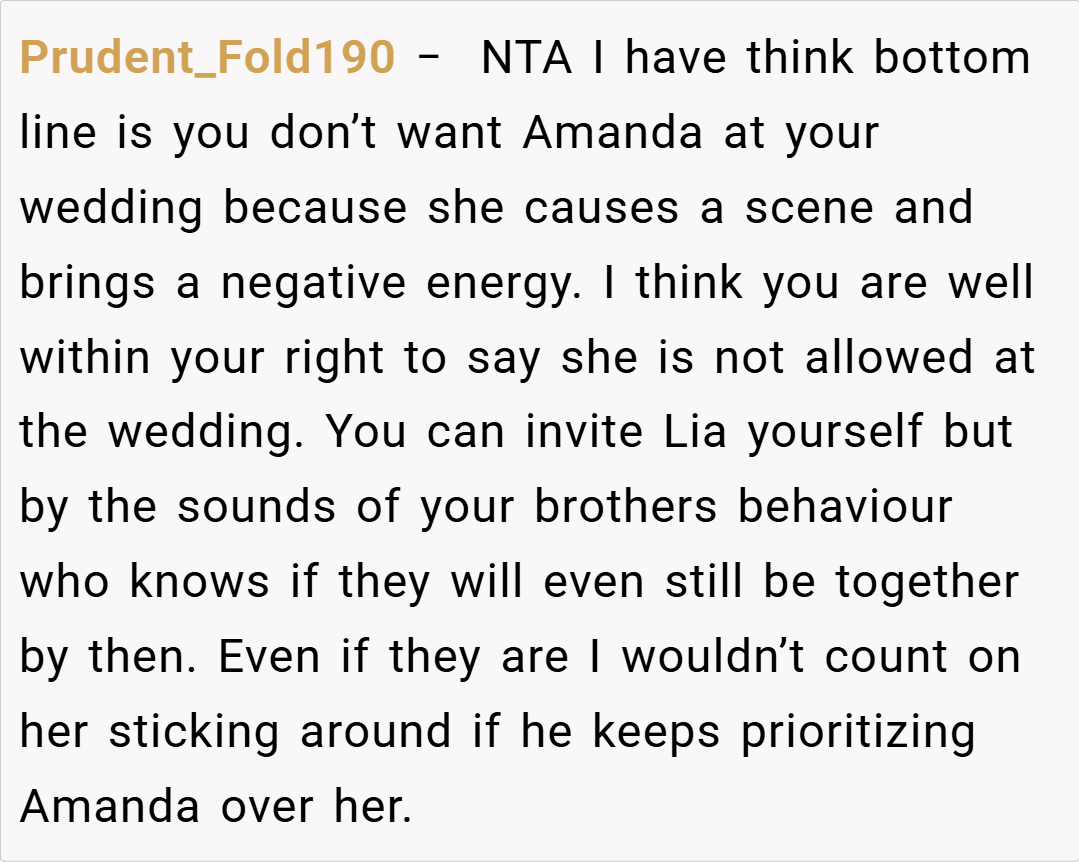 The OP’s long-standing friendship with her brother means she values his presence, but she also wants to ensure that his guest does not bring undue drama. Experts argue that when a family member consistently chooses a plus one that has a questionable track record—like Amanda, who has a history of inconsiderate behavior—it undermines the cohesive atmosphere that should be maintained at such an event.
