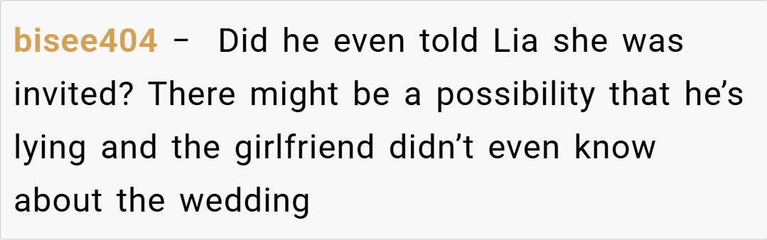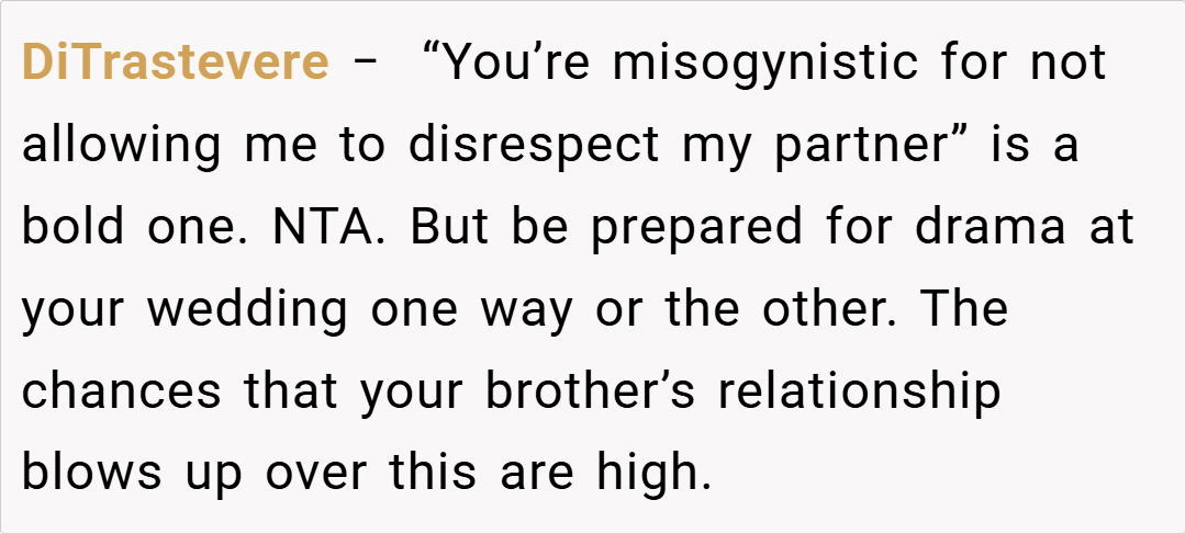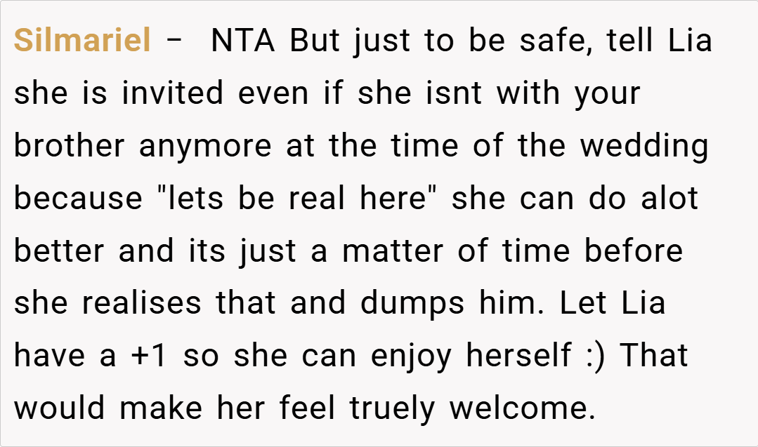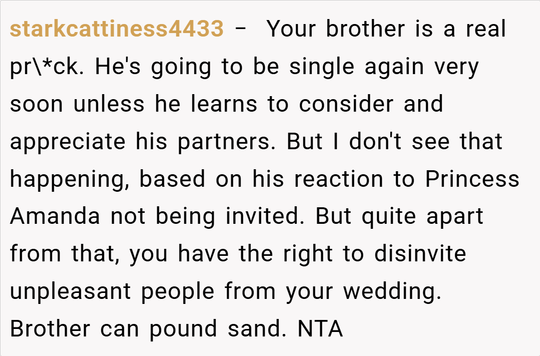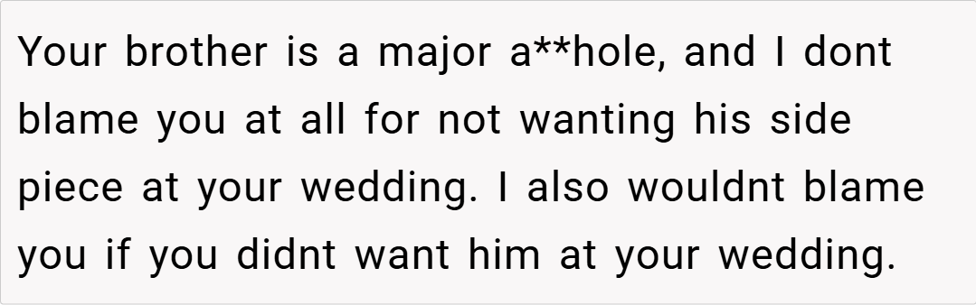 Others pointed out that the OP’s decision was simply about protecting her day, and that her brother should have thought more carefully about who he brought. A few commenters sympathized with her brother, arguing that the rejection felt personal, but overall, the majority agreed that maintaining a respectful and stress-free environment on a wedding day is paramount.