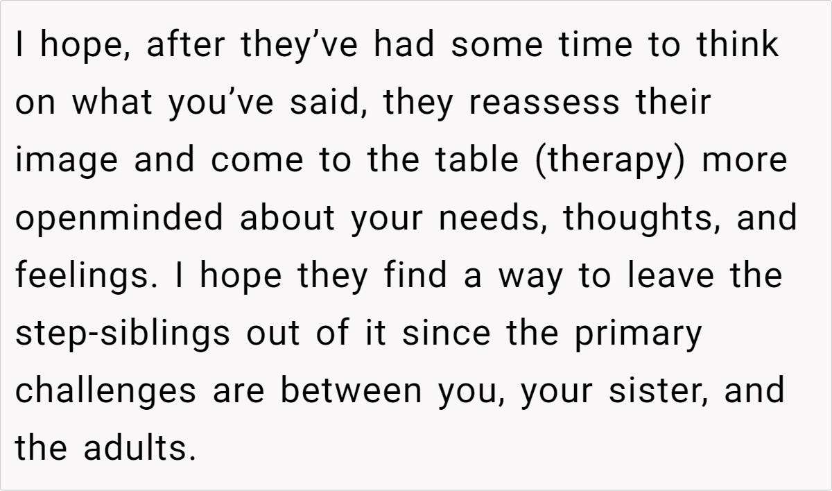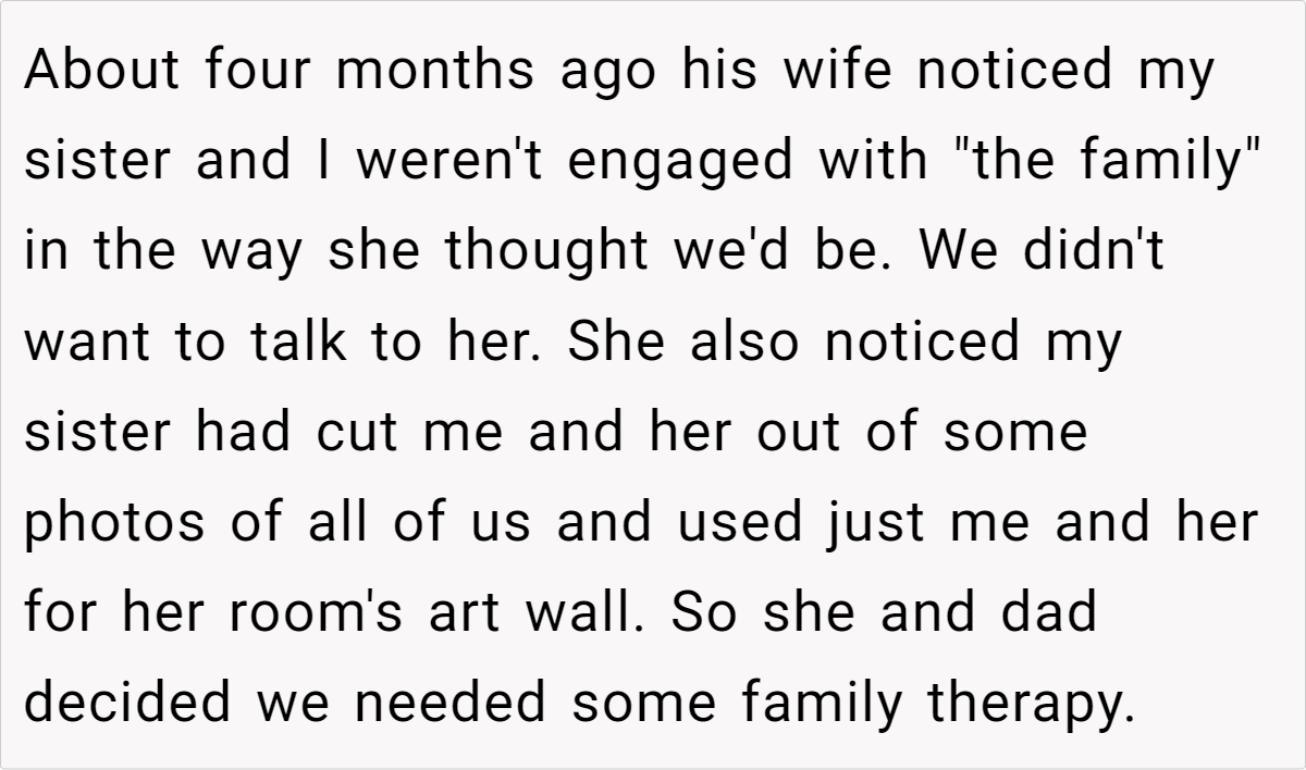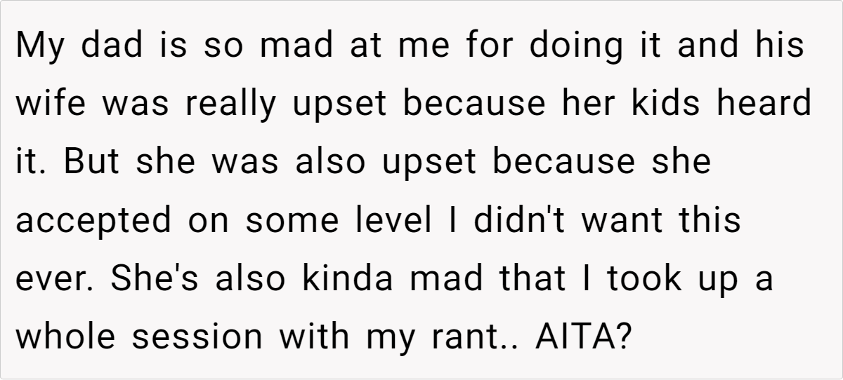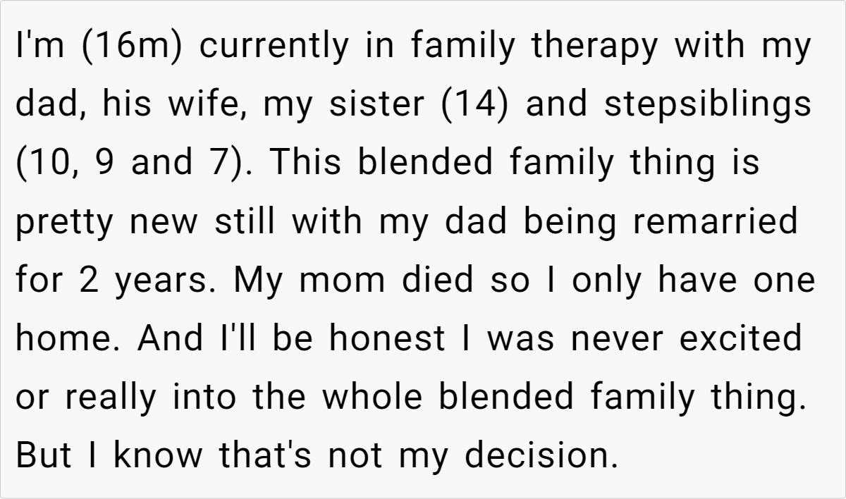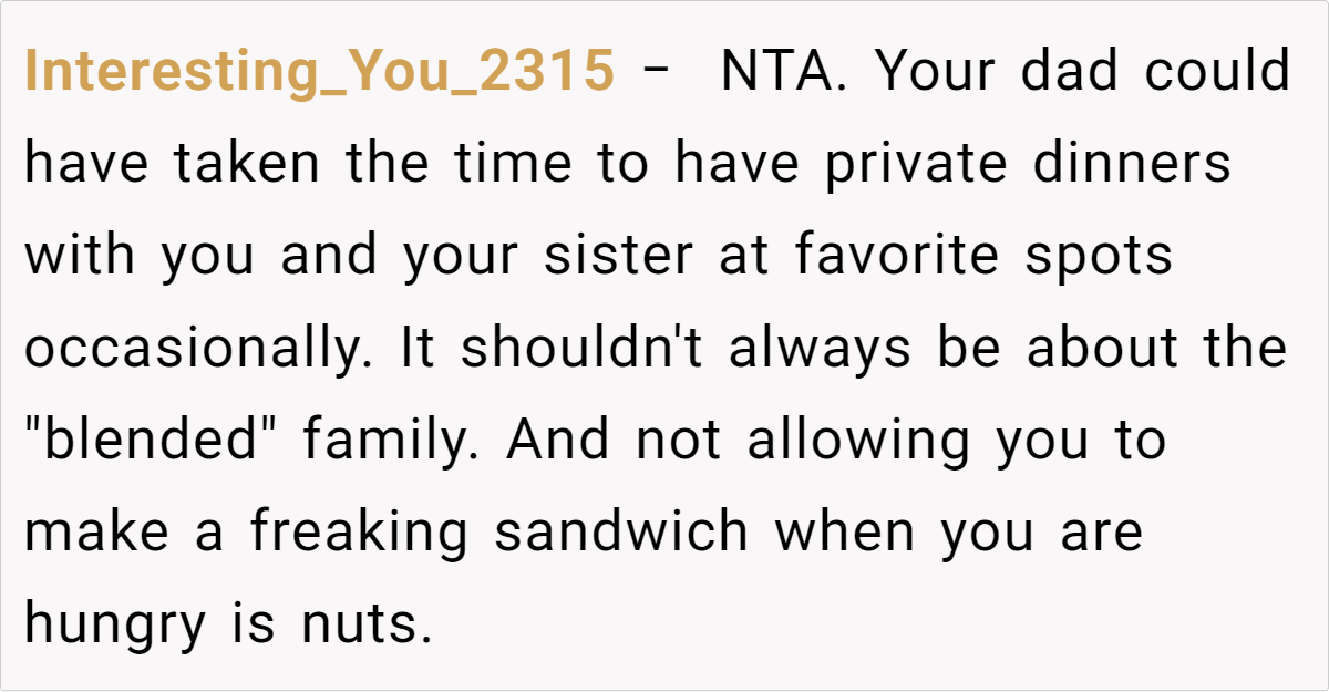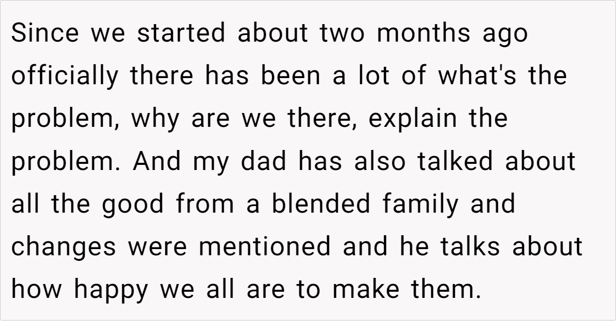 While his father and stepmother emphasize the importance of family unity and the sacrifices made for the sake of the blended family, the OP feels unheard and disregarded, leading to a breakdown in communication and a buildup of resentment. This situation raises questions about the challenges of blending families, the importance of validating individual experiences, and the potential consequences of prioritizing one family unit over another.