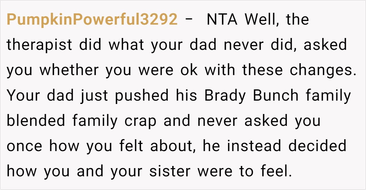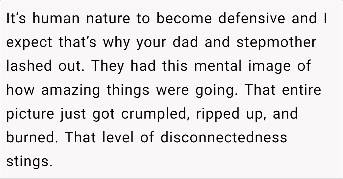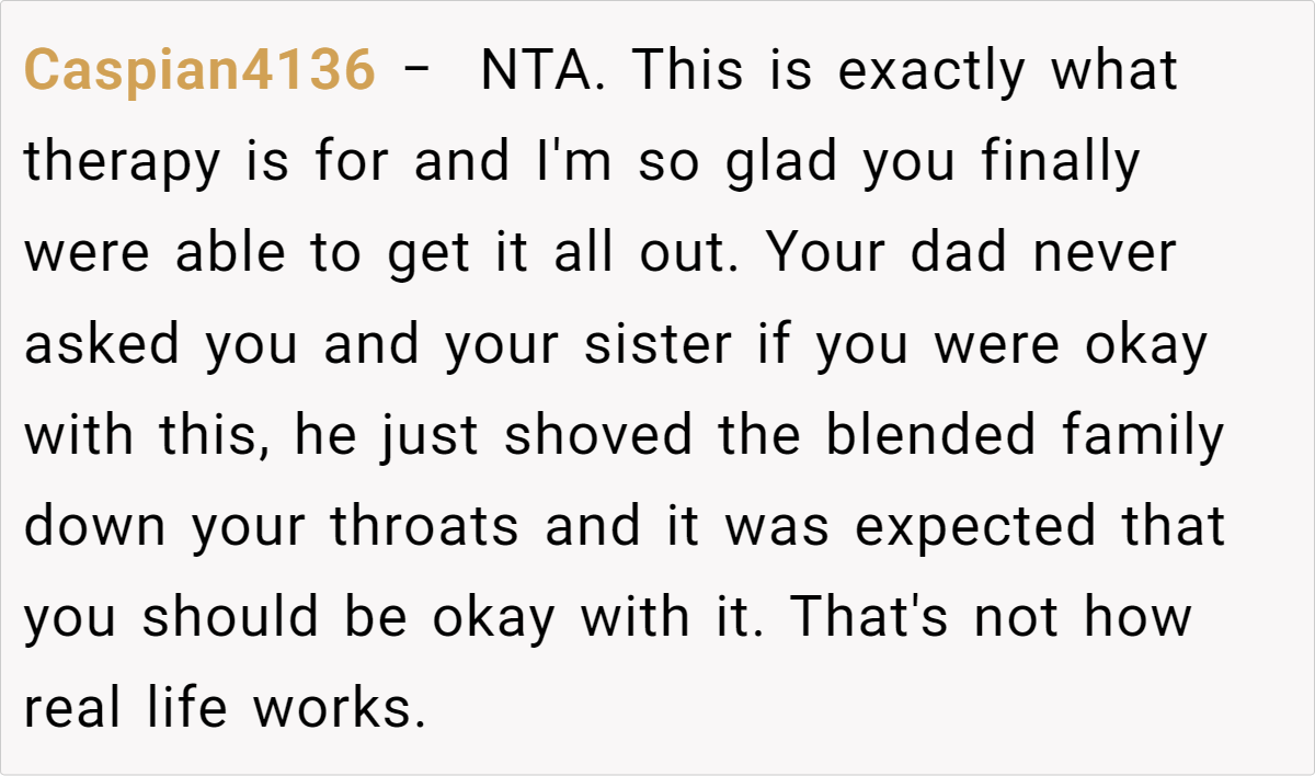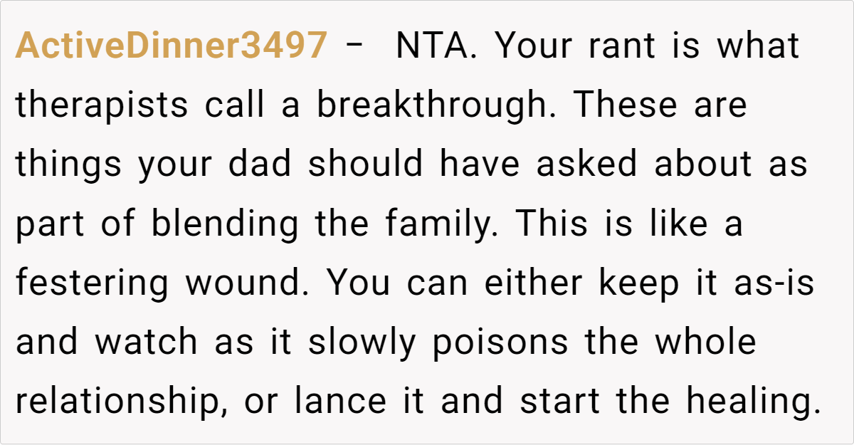 Perel’s perspective highlights the father and stepmother’s misstep in minimizing the OP’s feelings and imposing a narrative of seamless integration. Their insistence on prioritizing the blended family unit over the OP’s individual needs likely contributed to his emotional outburst.