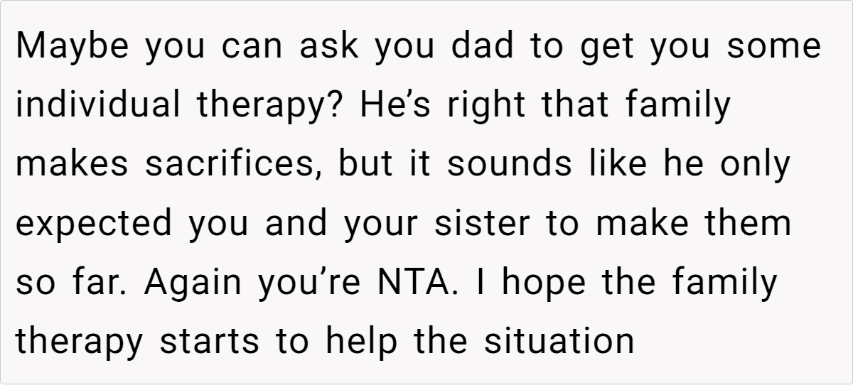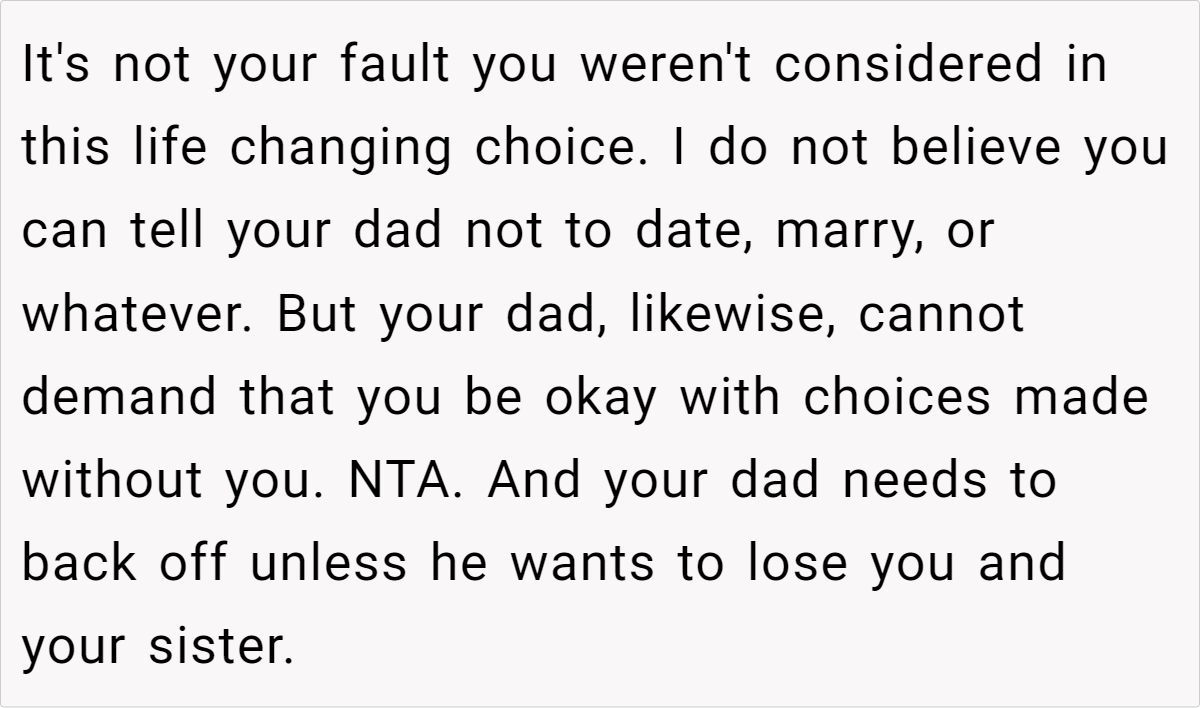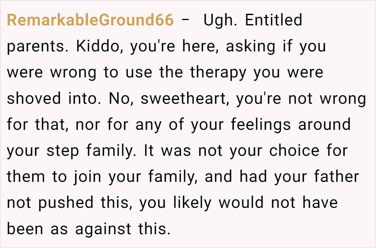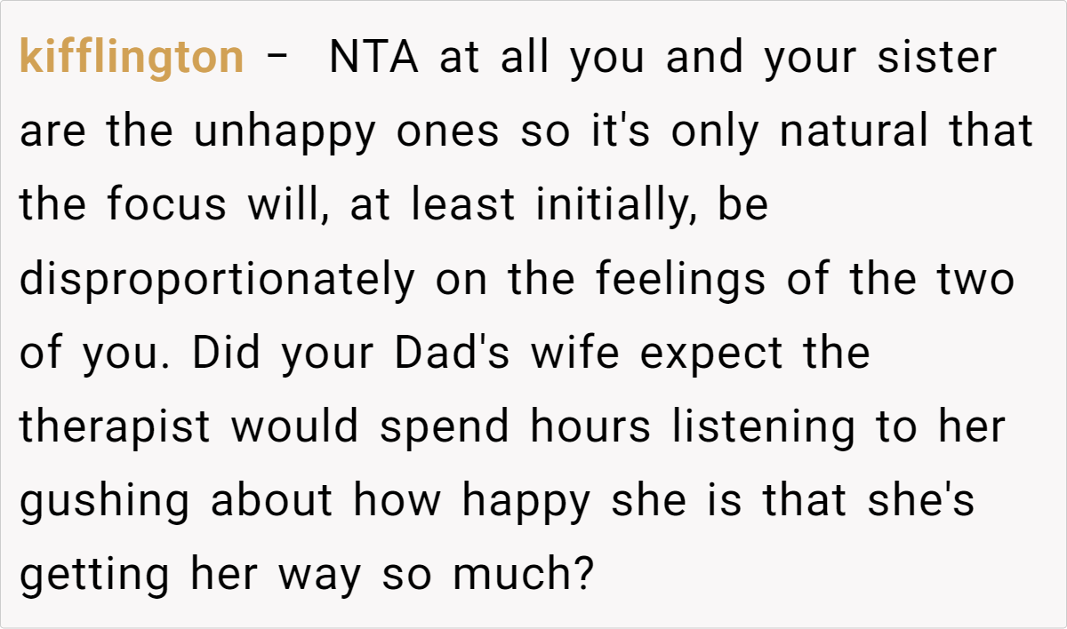 Perel’s perspective highlights the father and stepmother’s misstep in minimizing the OP’s feelings and imposing a narrative of seamless integration. Their insistence on prioritizing the blended family unit over the OP’s individual needs likely contributed to his emotional outburst.