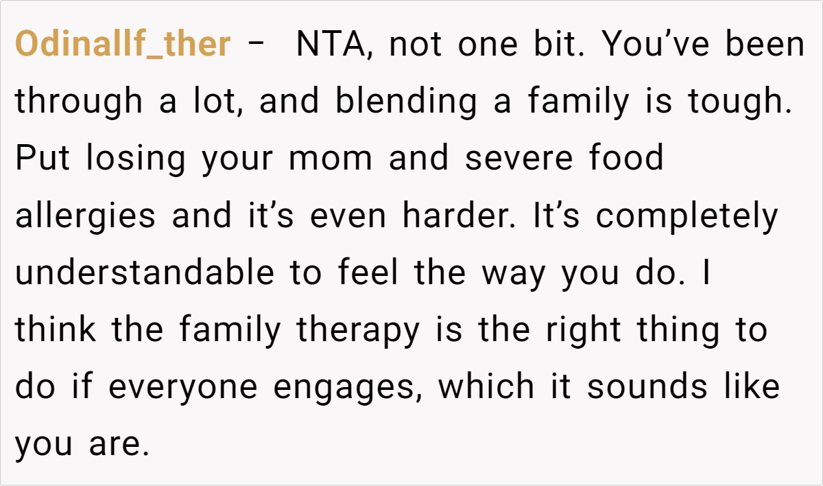 he desire to create a harmonious blended family is often met with the realities of individual needs and differing expectations. The OP, still grieving the loss of his mother, has been thrust into a new family dynamic that requires significant adjustments, particularly regarding food restrictions and altered traditions.