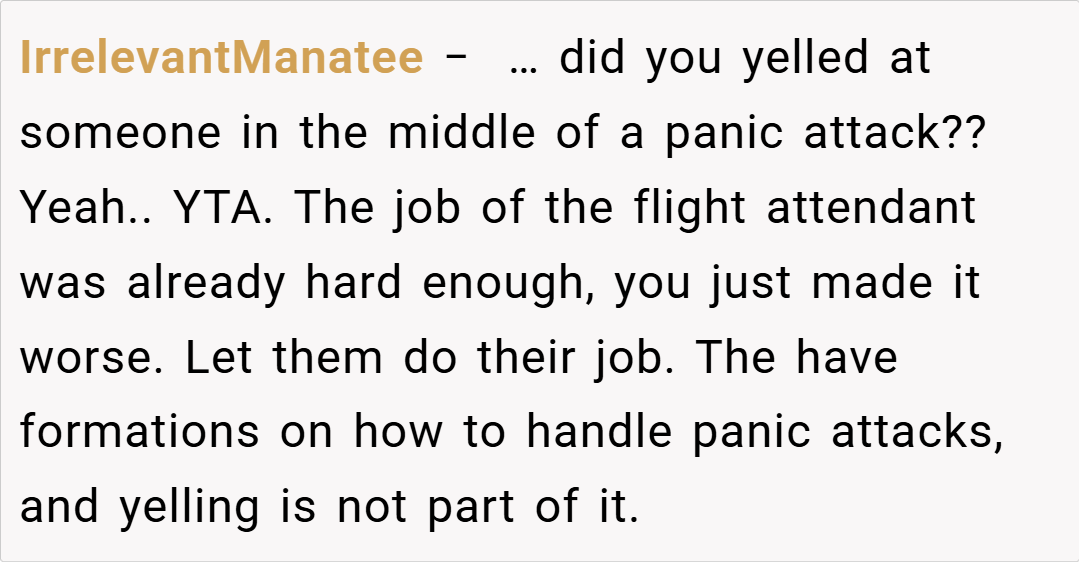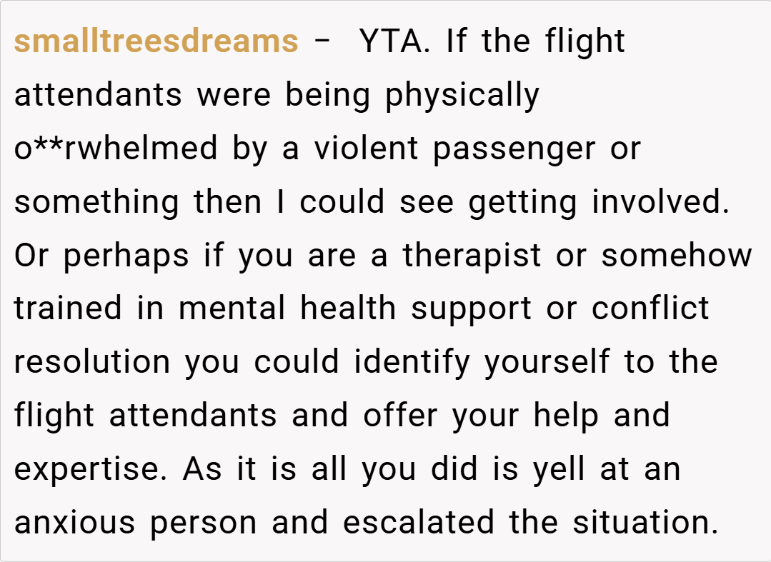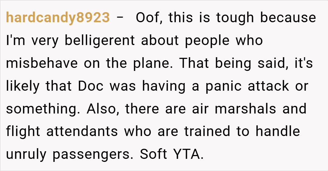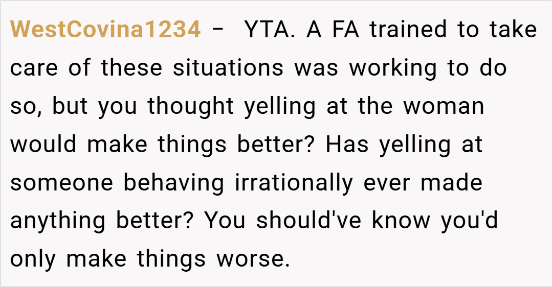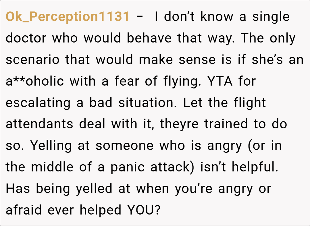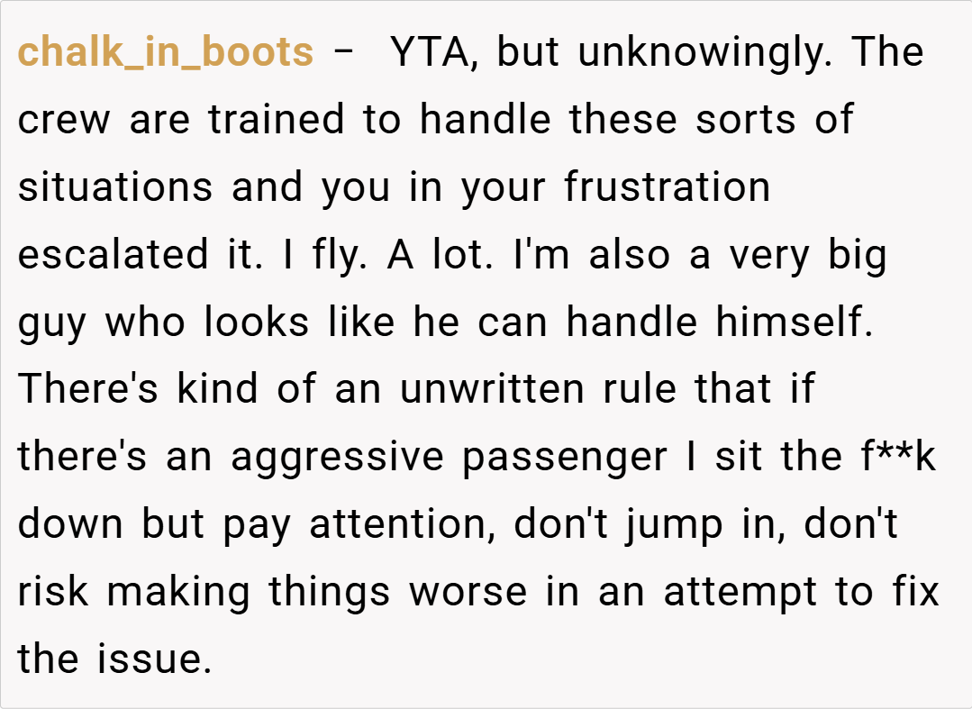 A popular take from a Redditor pointed out that while the urge to intervene is understandable, the flight crew are specially trained for these moments. They noted that stepping in without backing from the professionals only risks worsening the situation. According to this perspective, letting the experts handle the crisis might have been the wiser course—no matter how outrageous the other passenger’s behavior appeared.