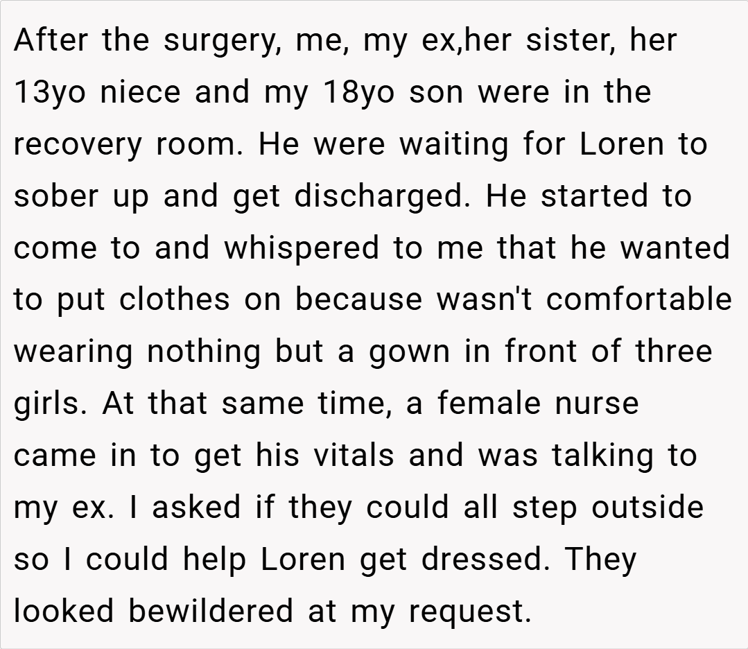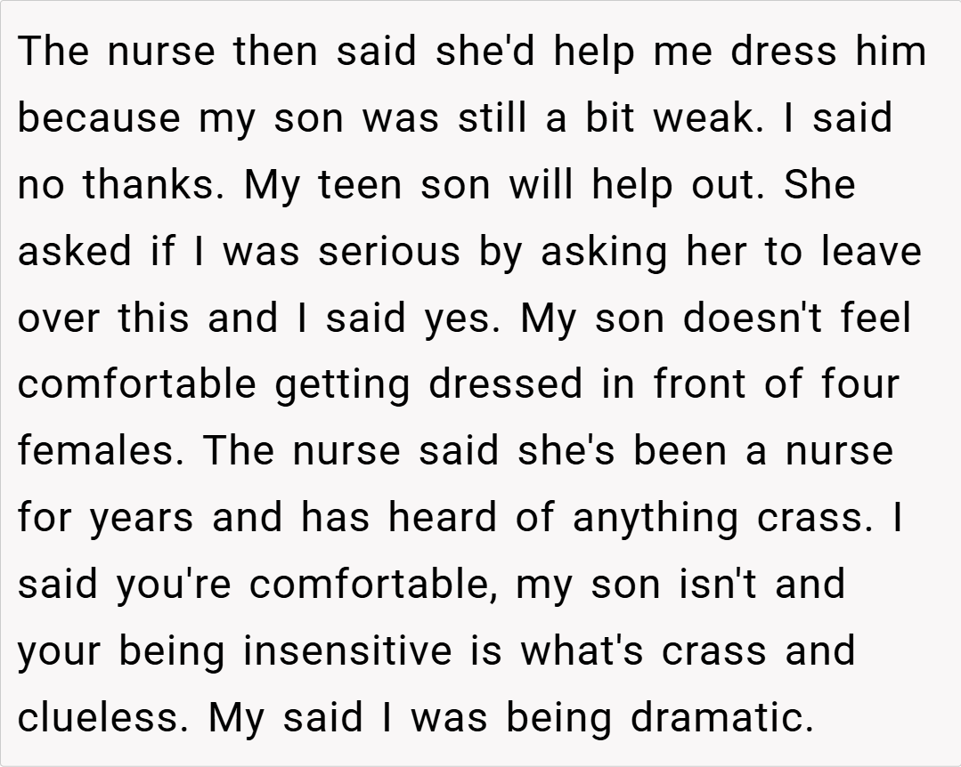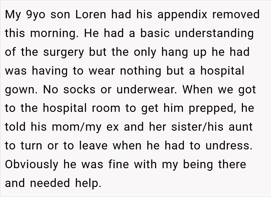 When it comes to caring for your child, his comfort and privacy should always be a top priority. In this case, OP recounts a stressful day at the hospital after her 9‑year‑old son, Loren, had his appendix removed. Despite having several female family members and a nurse present, Loren made it clear he didn’t feel comfortable undressing and getting dressed in front of them.