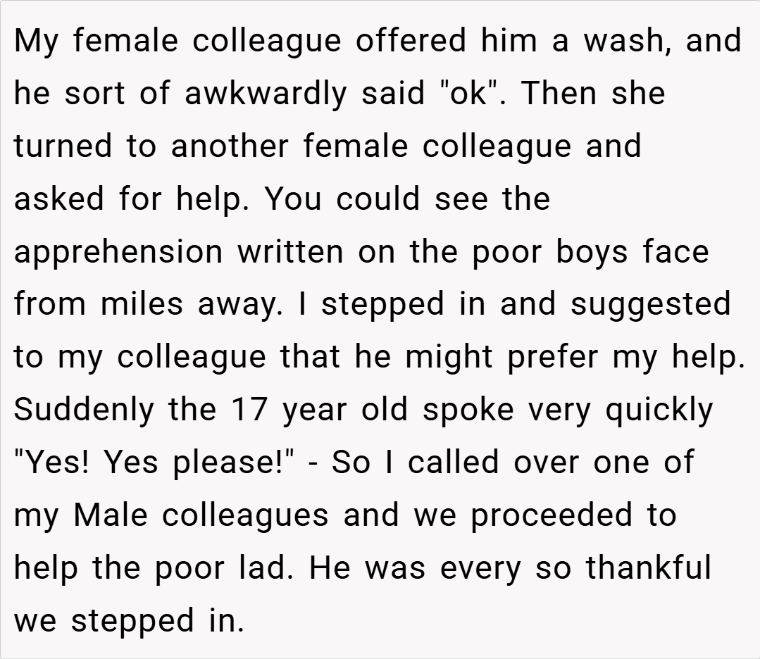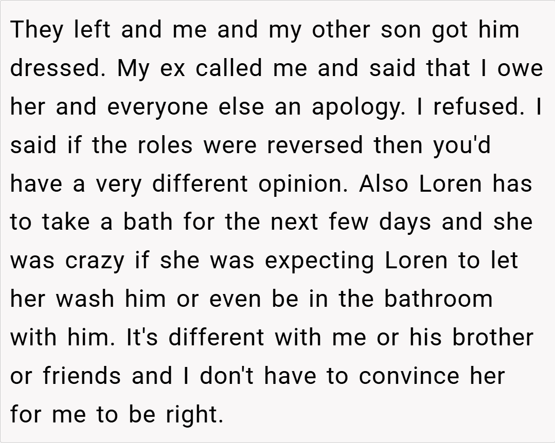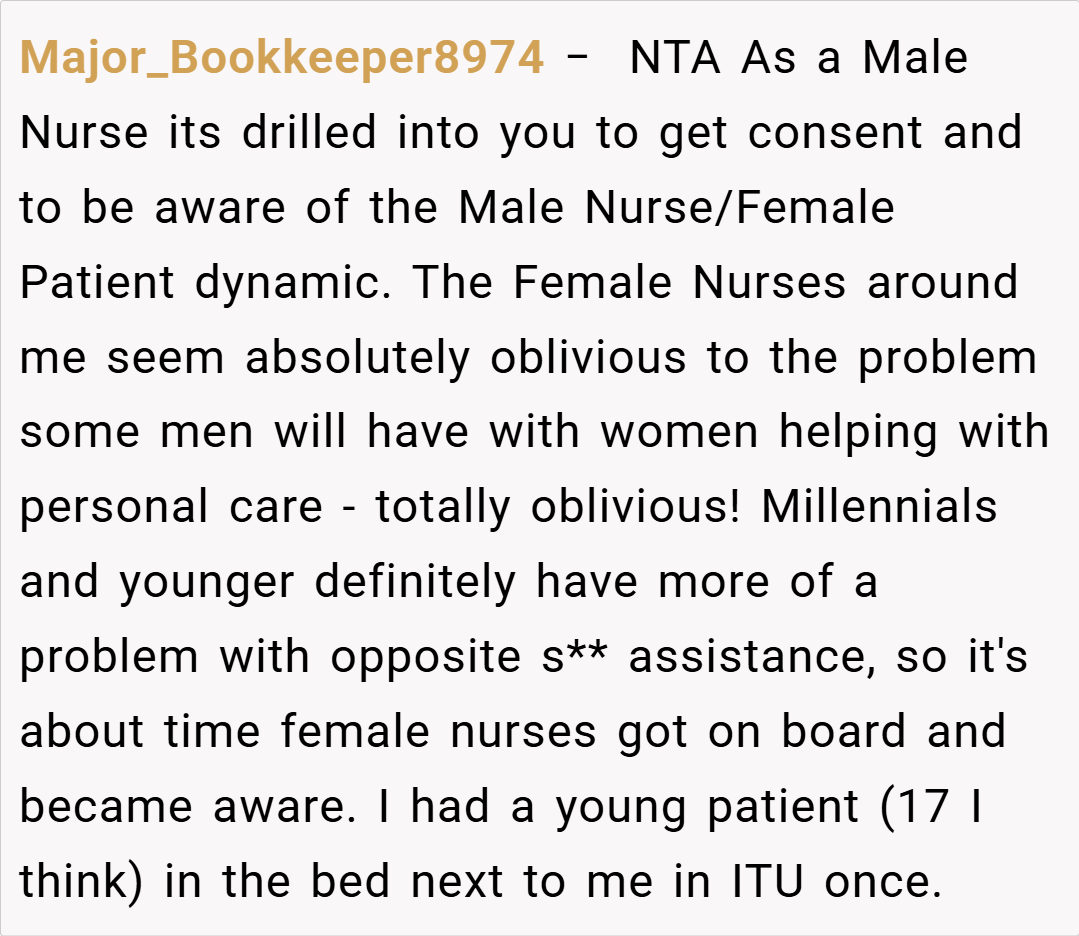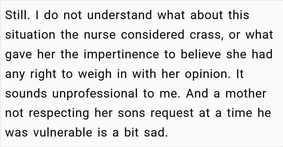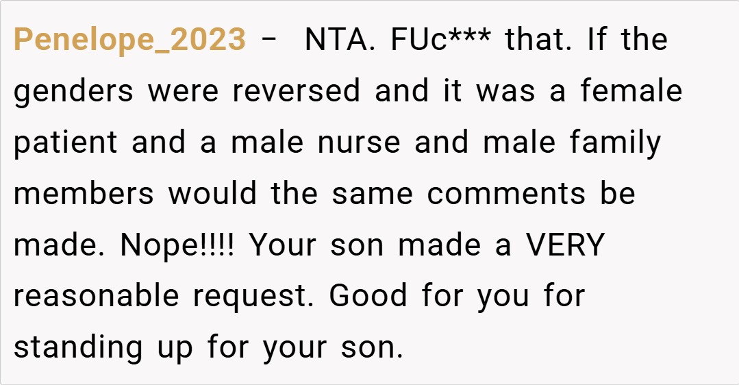 OP stepped in to assert his privacy by asking everyone to leave the room, insisting that his modesty needed to be respected. Although some have argued that her approach was abrupt or disrespectful, OP’s actions were driven solely by a desire to protect her son’s dignity and emotional well-being during a vulnerable time.