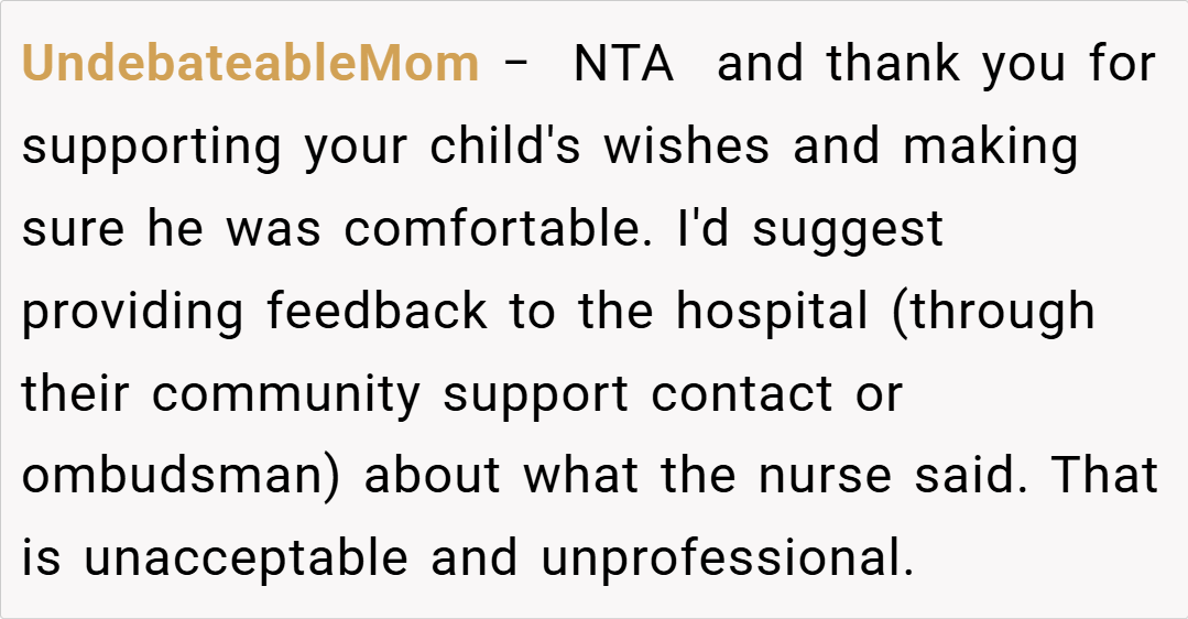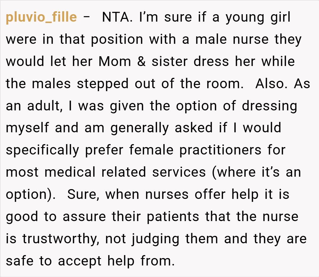 Family therapist Dr. Susan Johnson adds, “It’s important for parents to advocate for their children, even if it means challenging the norms of a hospital environment. While it may seem dramatic to some, insisting on privacy in a vulnerable moment is completely valid. Effective communication about boundaries is essential, and OP’s stance is justified when her child’s comfort is at stake.”(kidshealth.org)