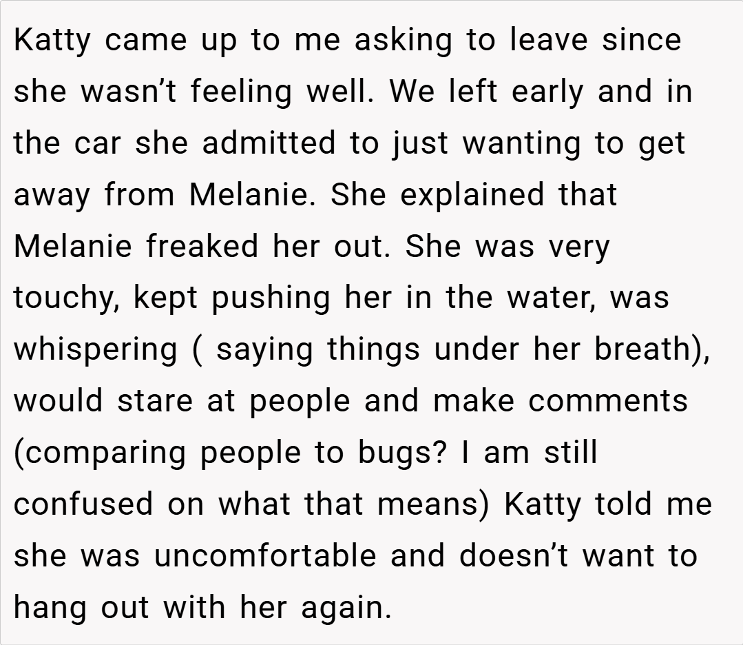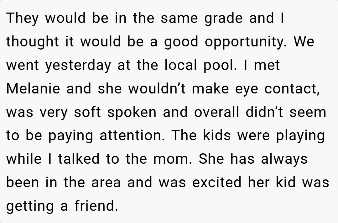 After a local pool playdate left Katty visibly uncomfortable, the mom tried to politely decline future meetups. However, when pressed by Melanie’s parent for more details, emotions flared, and she bluntly remarked that Melanie was “weird.” Now, with the incident making waves on social media, she wonders if her honesty crossed the line.