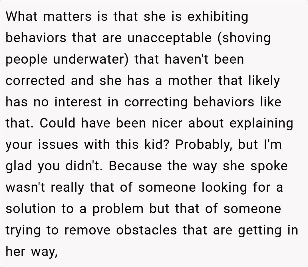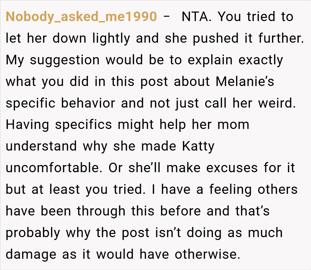 However, the delivery, coming off as a blanket judgment of Melanie’s character, might be seen as unnecessarily harsh. This can not only hurt Melanie’s parent but also potentially label a child in a way that might affect future perceptions. While the mom’s decision to speak her mind was driven by a protective instinct for her daughter, many believe that such sensitive matters are best handled in private conversations rather than public forums.