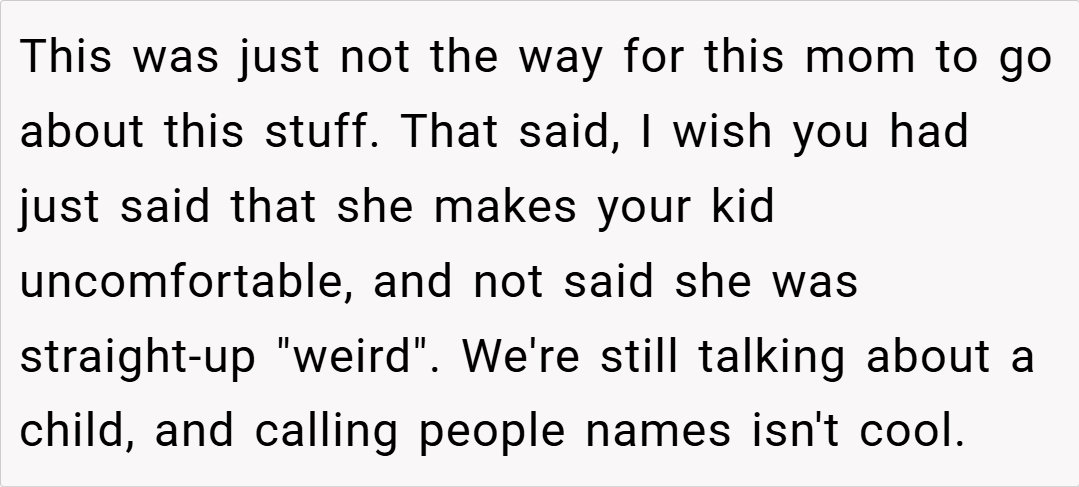 Ultimately, while the mom was trying to convey her daughter’s discomfort, her choice of words has sparked controversy. Finding a balance between honest expression and kindness is key. As parents, our words have power, and using them thoughtfully can help create a more supportive environment for all children involved.