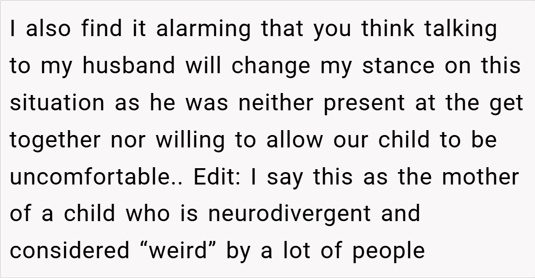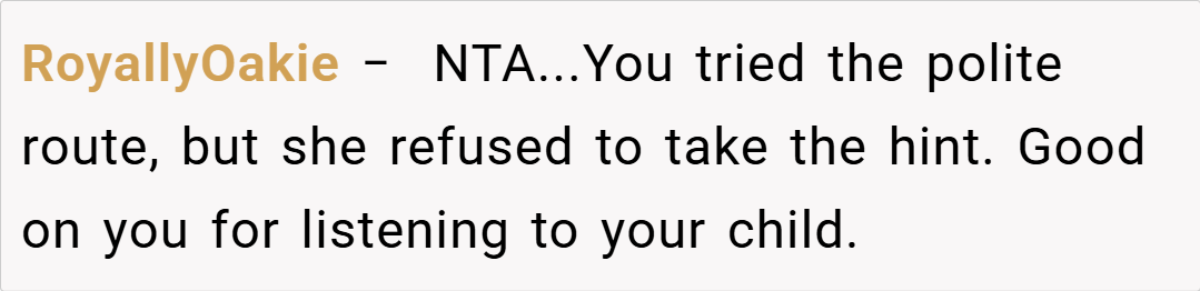 What do you think? Is it acceptable to use such direct language when your child is clearly uncomfortable, or should there be a more measured approach? Share your thoughts, experiences, and advice in the comments—let’s navigate these tricky social waters together.