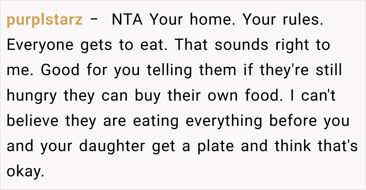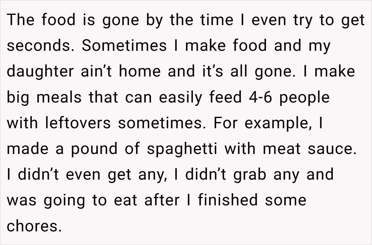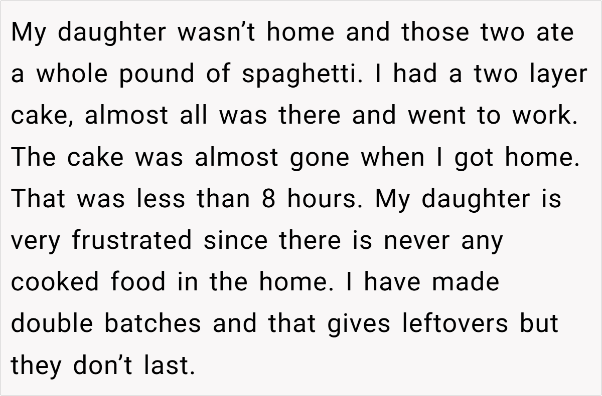 This left no leftovers for the daughter, who wasn’t always home, and resulted in wasted food and increased grocery bills. After several episodes of meals disappearing before anyone else could get a taste, the parent decided that a change was necessary to protect both their wallet and everyone’s fair share.