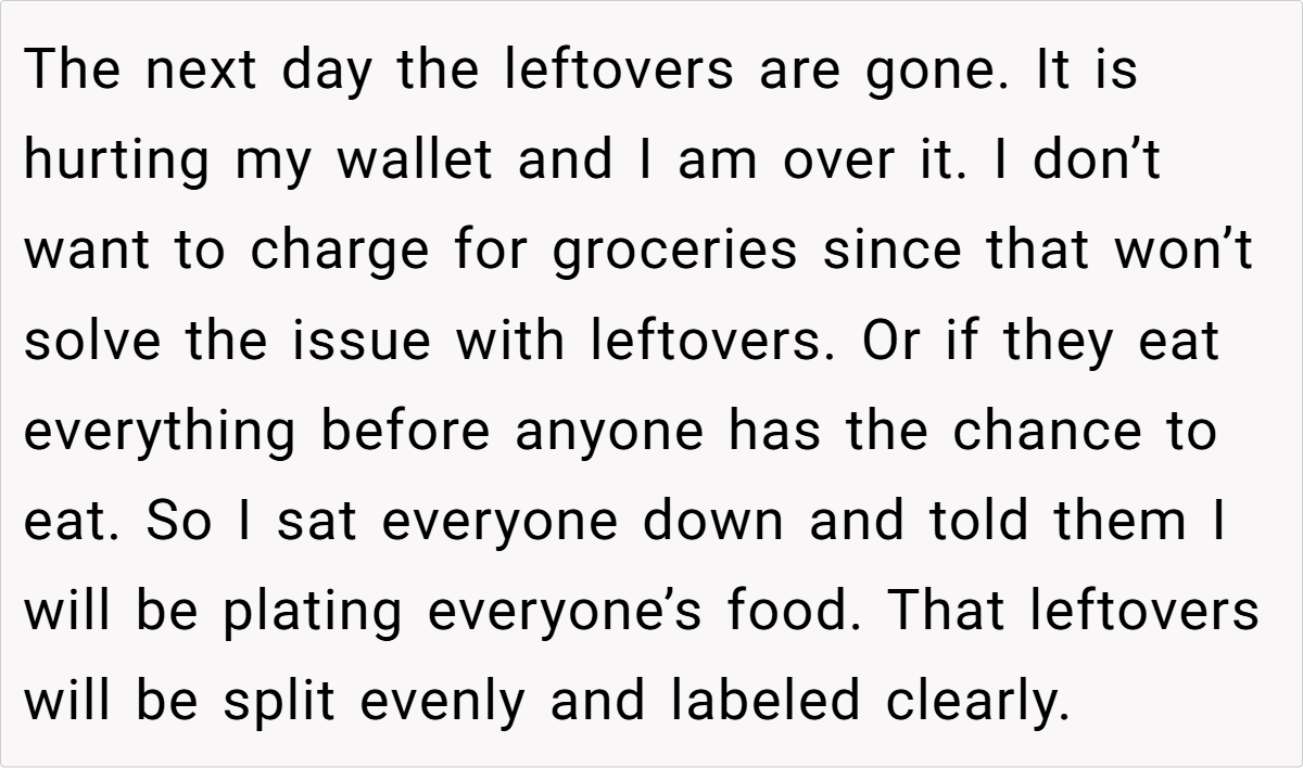 When one member feels that their needs are consistently sidelined, a structured system can help balance things out.” In this case, the parent’s decision to plate food and label leftovers wasn’t about control—it was about ensuring that every family member got their fair share, especially when imbalances in appetite were leading to waste and frustration.