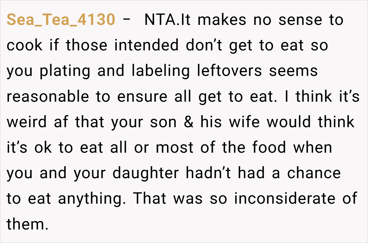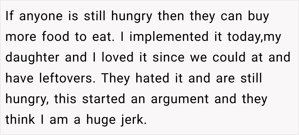 Determined to restore order, the parent instituted a new rule: from now on, they would plate each person’s food and clearly label and evenly split any leftovers. While this plan brought relief to the daughter, who finally enjoyed some leftovers, it sparked an immediate backlash from the son and his wife. Now, the family is left debating whether these strict measures were a necessary fix or an overreaction that disrupted the free-flowing dynamics of mealtime.