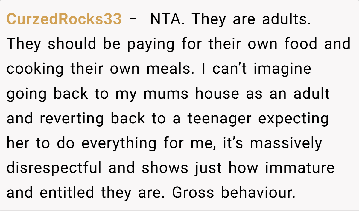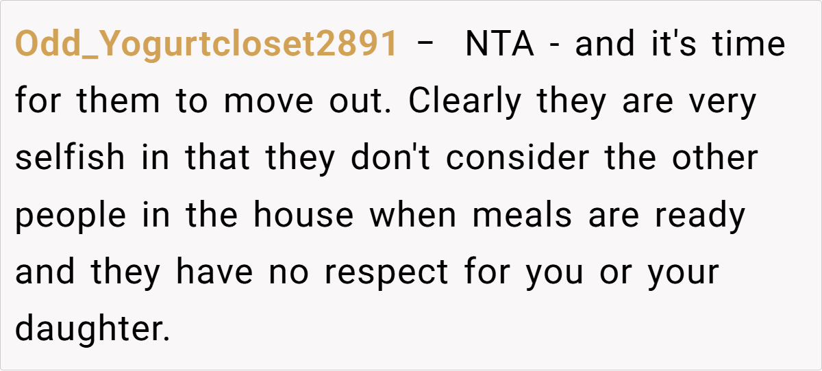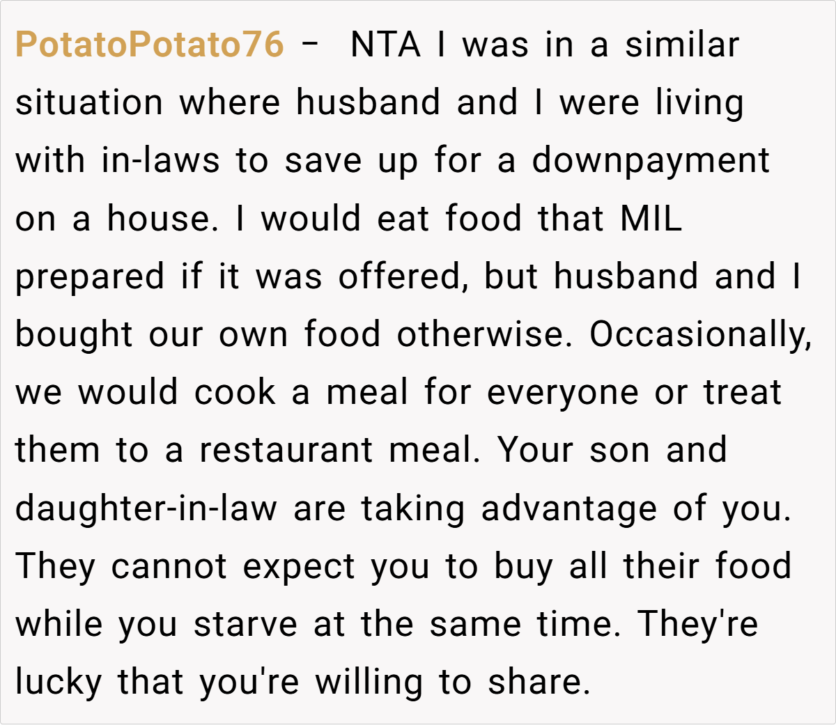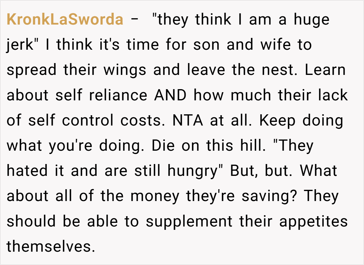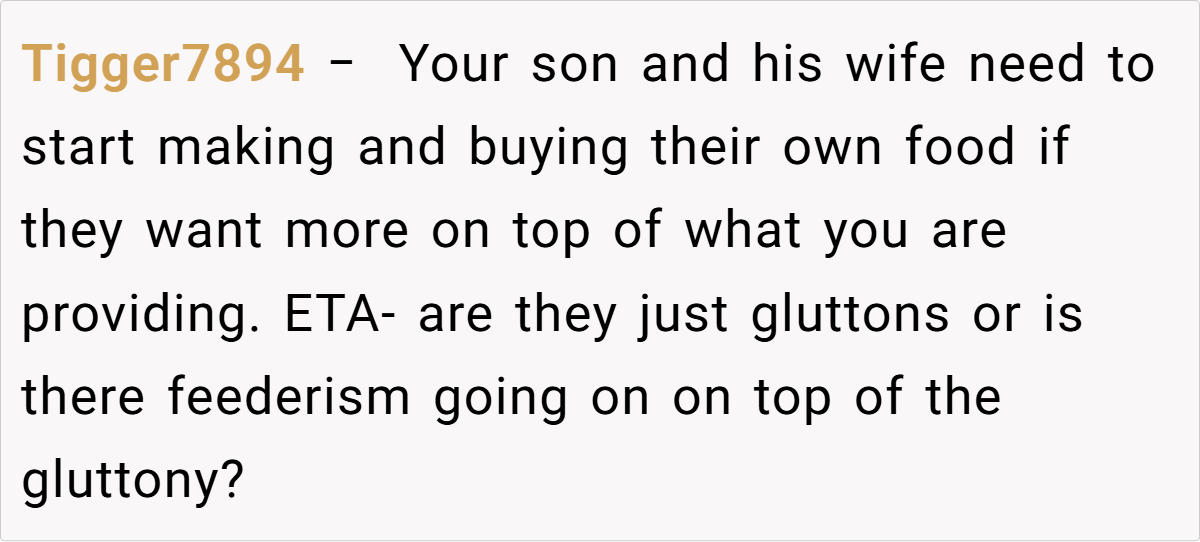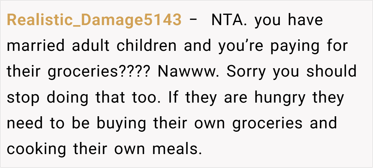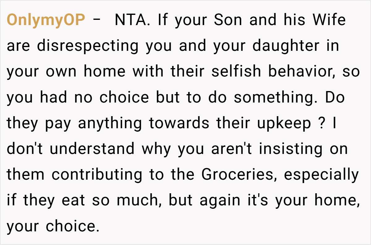 Here, the parent’s goal was to save money and prevent the continual disappearance of food, a decision aimed at fostering a fairer environment for all. Although the son and his wife felt slighted by the new system, this approach highlights the importance of setting practical boundaries to protect the collective interests of the household.