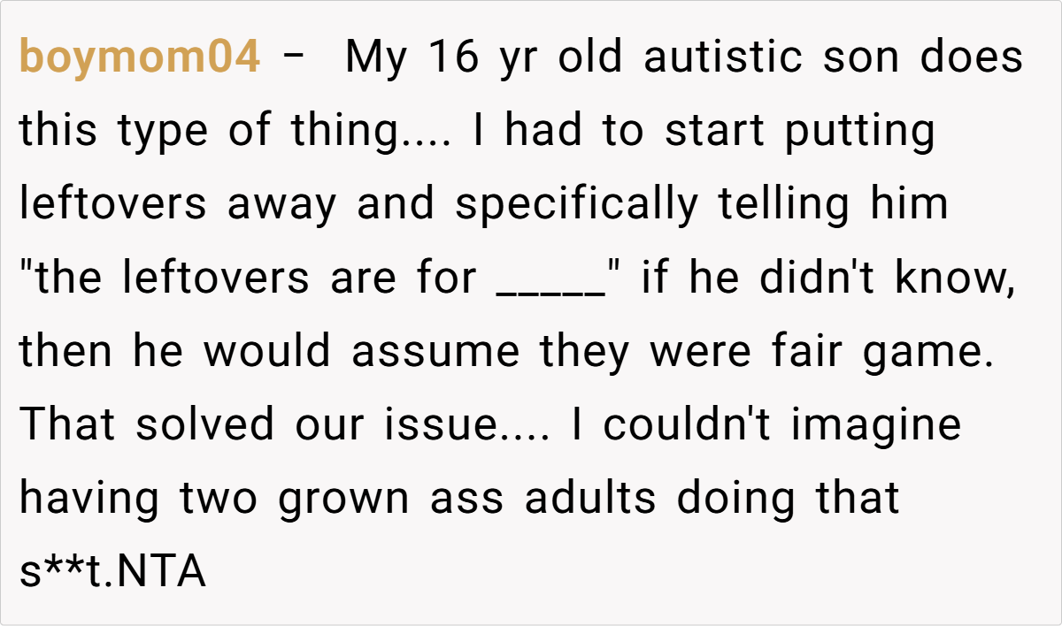 The Reddit community’s responses were mixed. Many users empathized with the parent’s exasperation, noting that it’s reasonable to implement a system when food consistently goes missing. Some commented that clear labeling and portioning might be the only way to ensure fairness in a household with varying appetites.