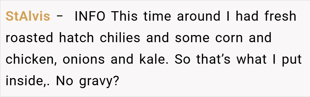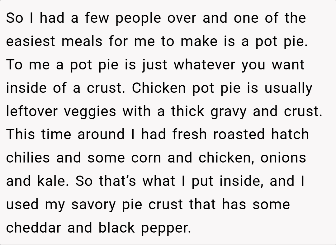 Sometimes, even a familiar dish can spark an unexpected family feud, and this story proves that food can be as divisive as it is delightful. In today’s tale, a home cook finds herself at the center of a culinary controversy when she proudly serves what she calls a “chicken pot pie” to guests. For her, pot pie is an opportunity to mix things up—a creative twist featuring fresh roasted hatch chilies corn,