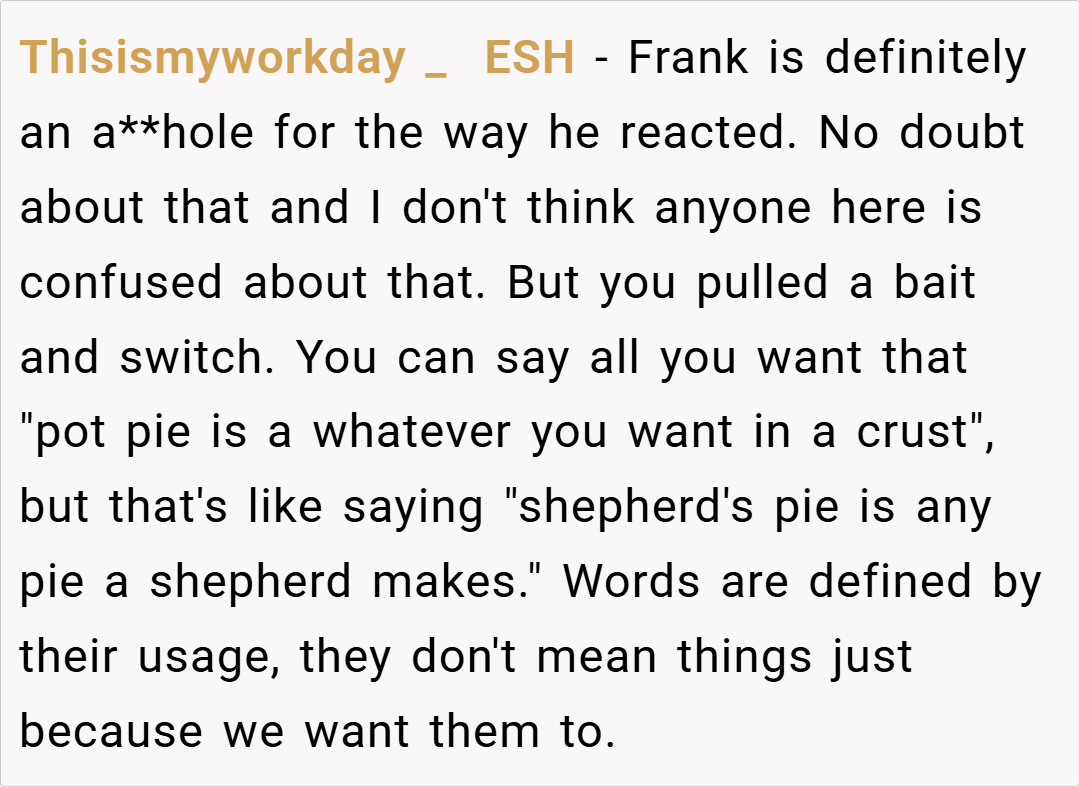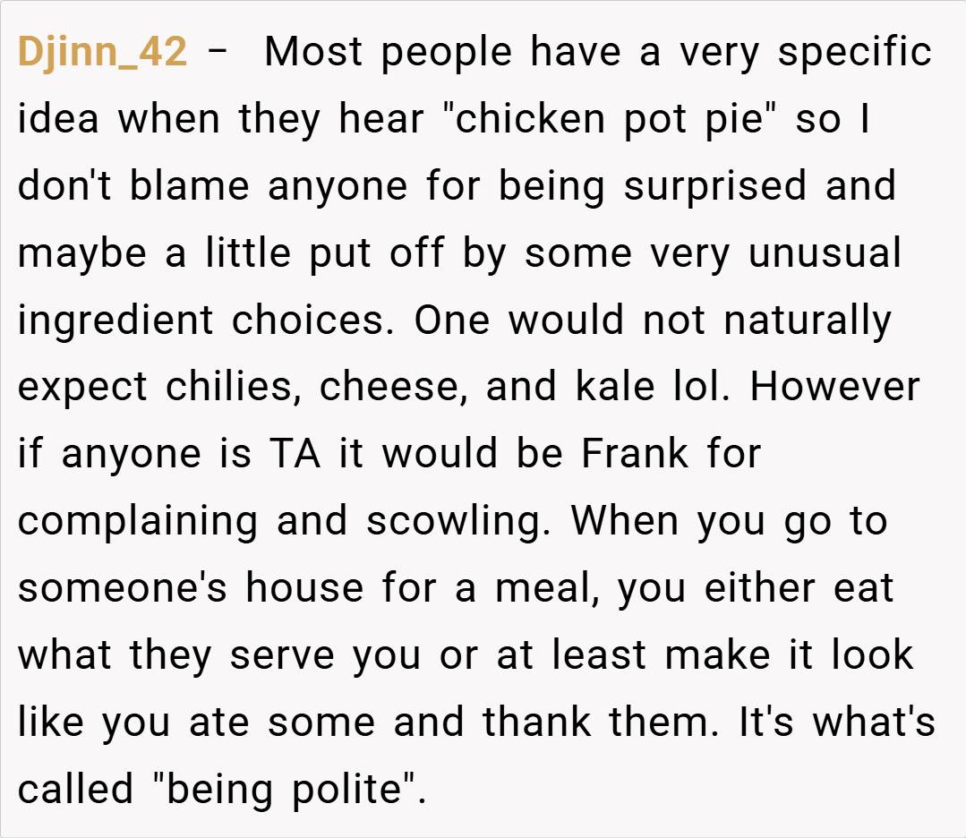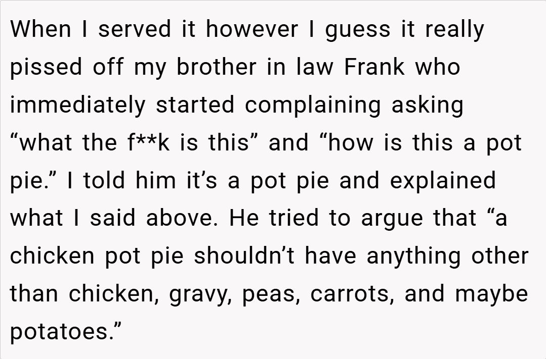 This perspective highlights that creativity in cooking should be celebrated—even if it means straying from the norm. For more insights on culinary creativity, visit https://www.altonbrown.com/. The conflict in this case centers on the clash between tradition and innovation. While some family members, like Frank, view the dish as a deviation from what a “proper” chicken pot pie should be,