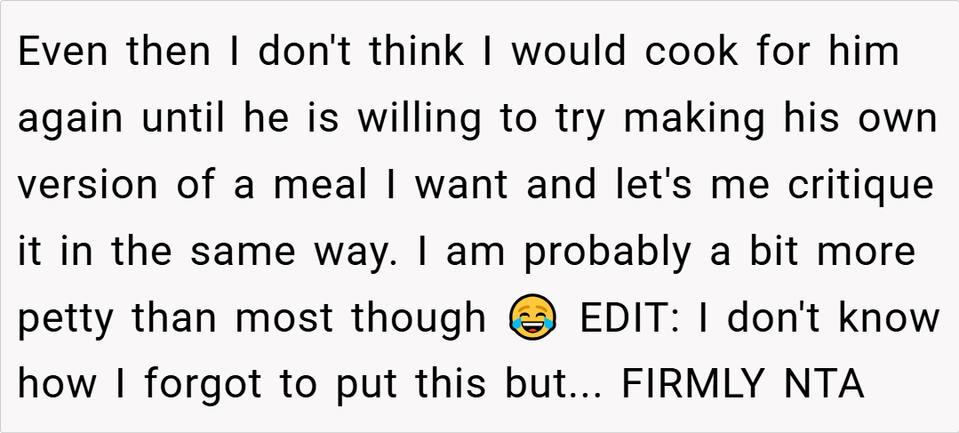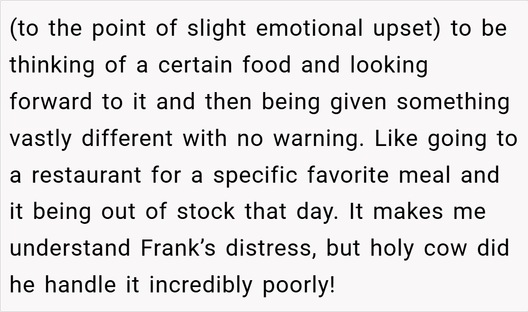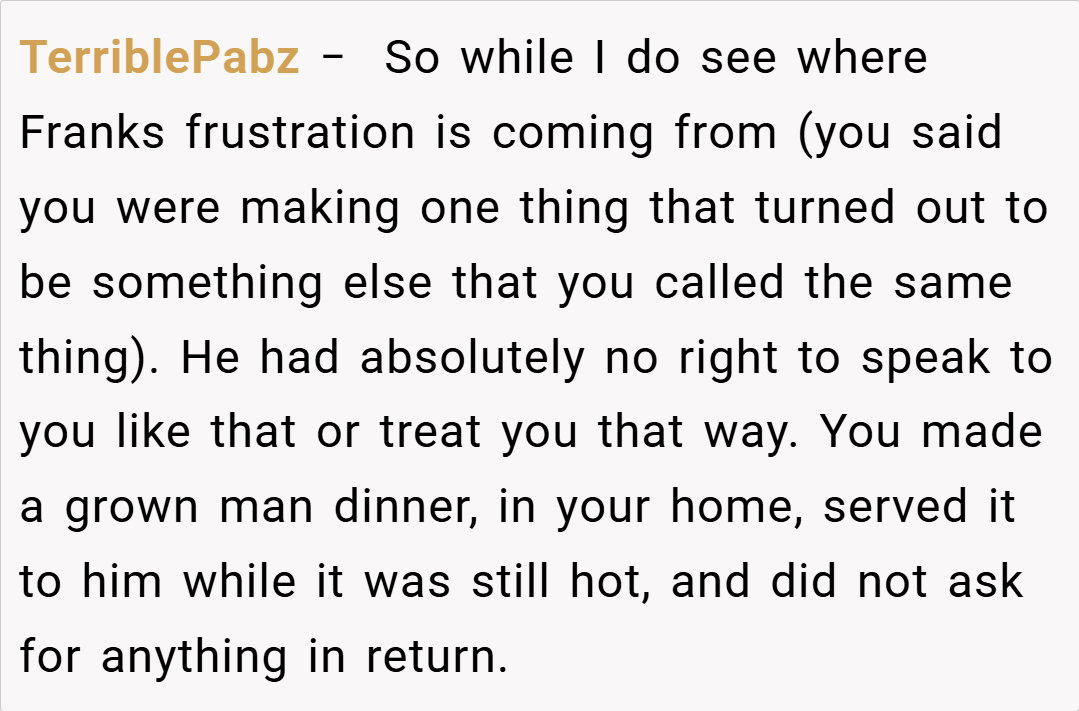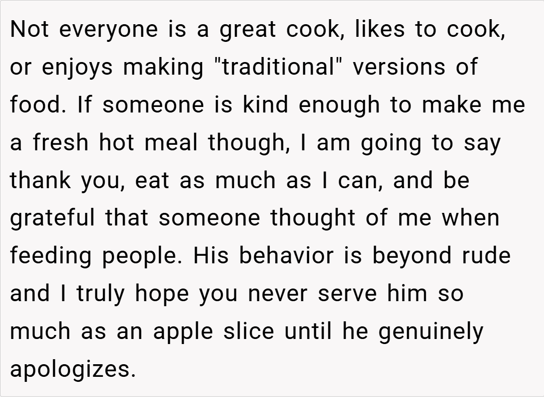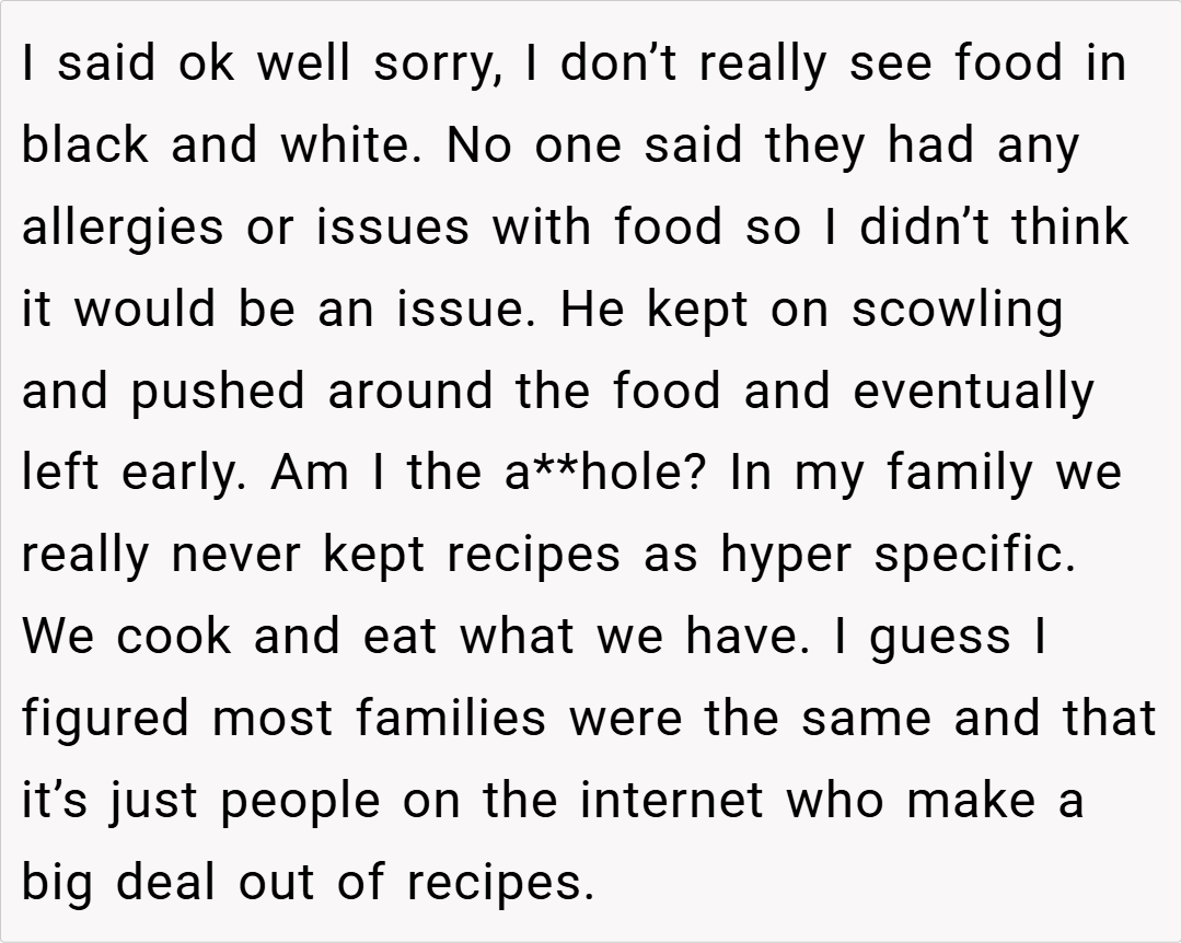 Moreover, disagreements over food can reveal deeper issues about identity and tradition within a family. In many households, recipes and their methods carry emotional weight, symbolizing memories and cultural heritage. When someone alters a traditional dish, it can feel like a personal slight to those who hold those memories dear.