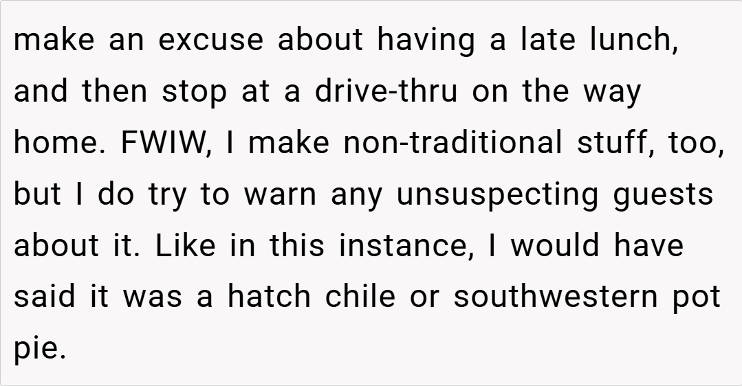 Many redditors sympathize with the host’s desire to experiment and innovate in the kitchen, arguing that food should be a reflection of personal taste rather than rigid tradition. Others, however, feel that her version strays too far from the classic recipe, insisting that some dishes have a time-honored formula that shouldn’t be tampered with. The lively debate highlights the passion people have for their food and the personal connections they form with culinary traditions.