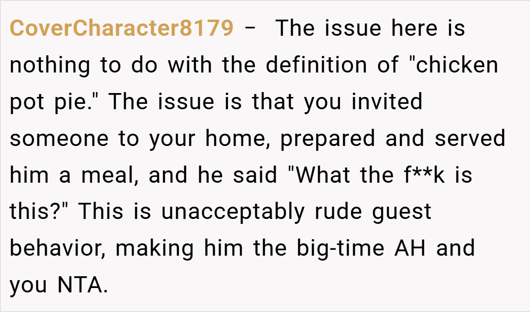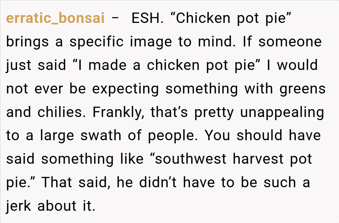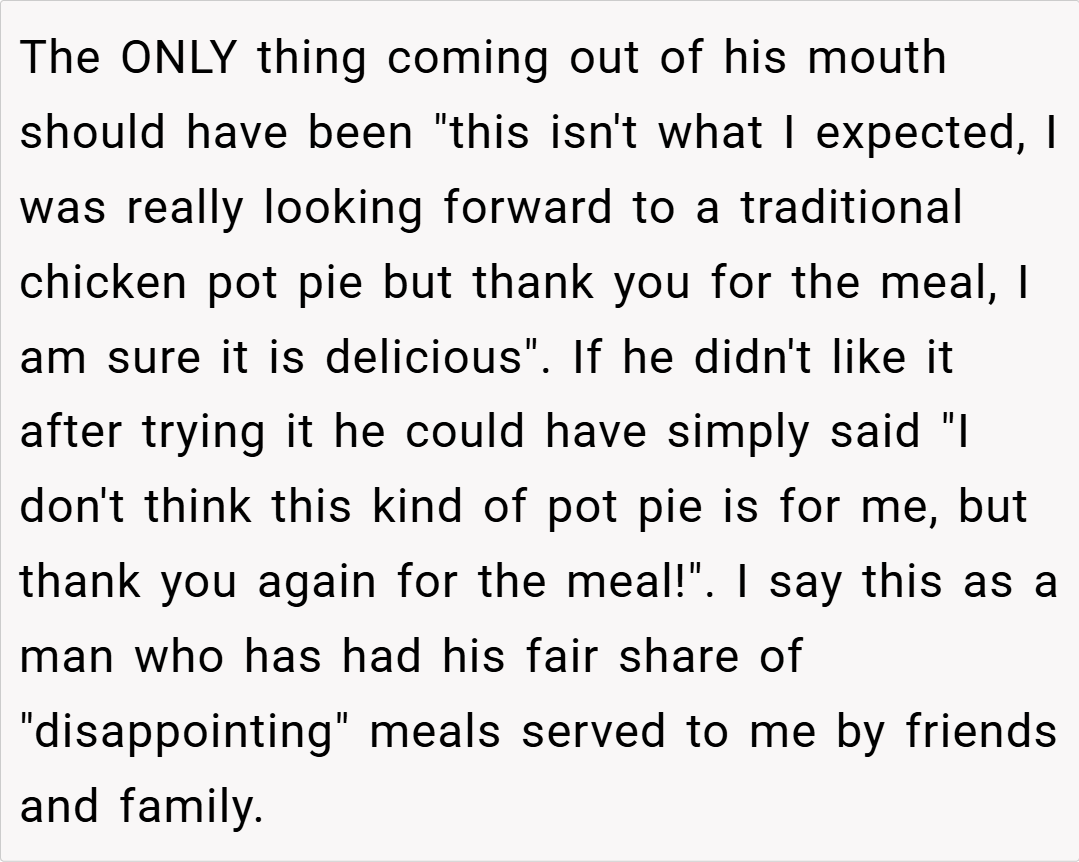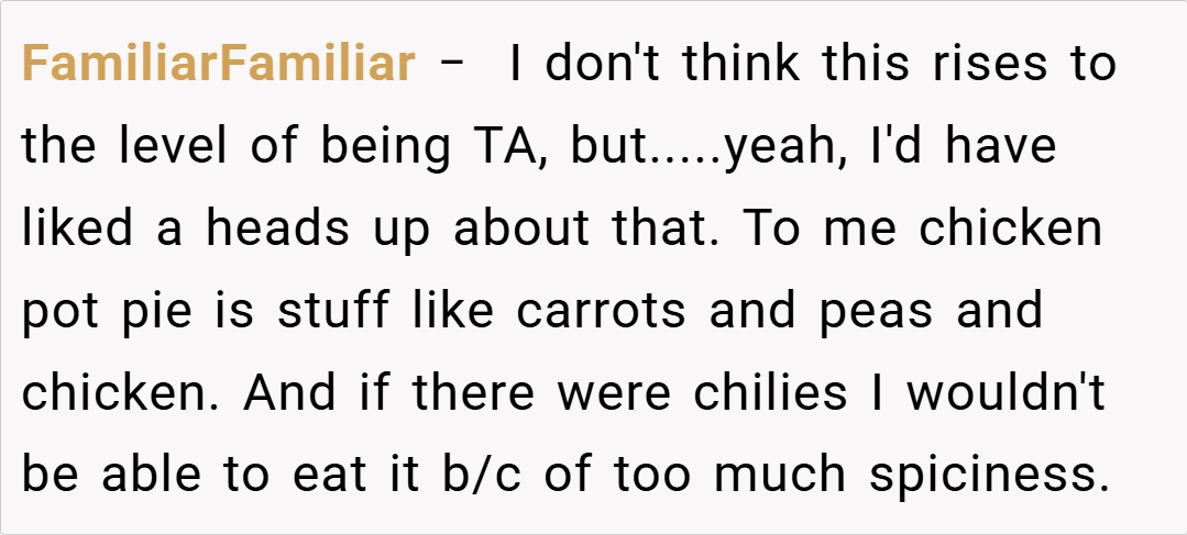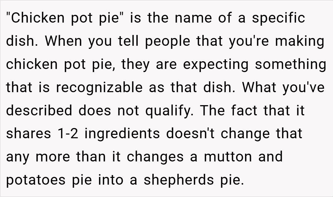 ‘AITA for telling everyone that I was serving “a chicken pot pie” for dinner when it wasn’t a plain and basic one?’