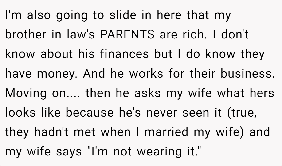 Imagine a casual night out with family turning into a heated debate about wedding rings and marital commitment. That’s the awkward situation facing OP, who finds himself defending his wife’s honor after his brother-in-law makes insensitive comments about her lack of wedding bling.