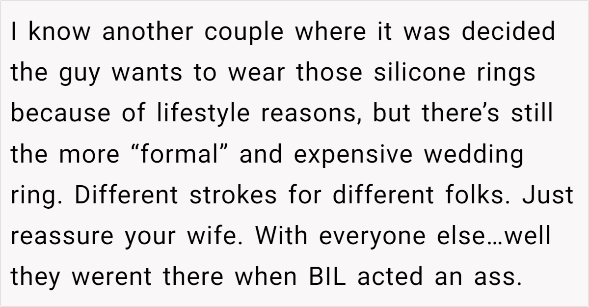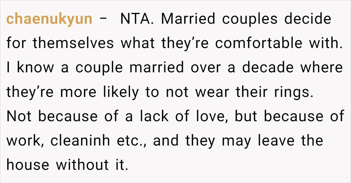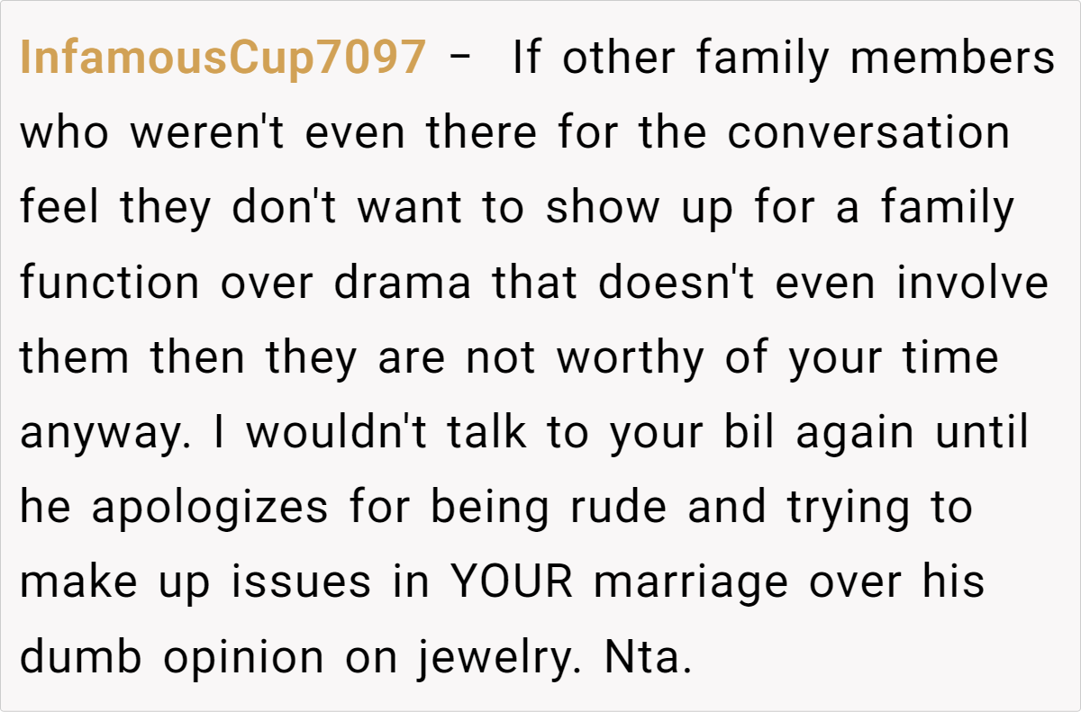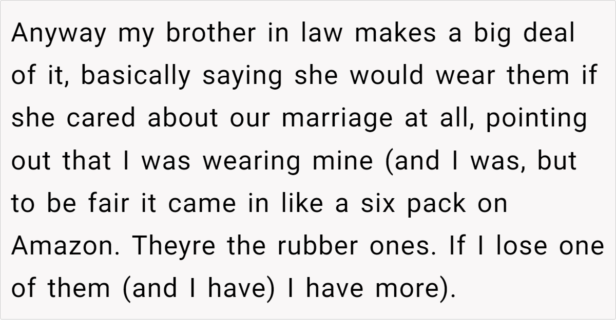 In this case, the brother-in-law’s criticism of OP’s wife for not wearing her wedding ring reflects his own values and beliefs about marriage, which may not align with OP and his wife’s. Dr. Gottman notes that “Each couple has their own unique way of expressing love and commitment, and it’s crucial for outsiders to respect those differences and avoid imposing their own judgments or expectations.” (Source: The Seven Principles for Making Marriage Work)