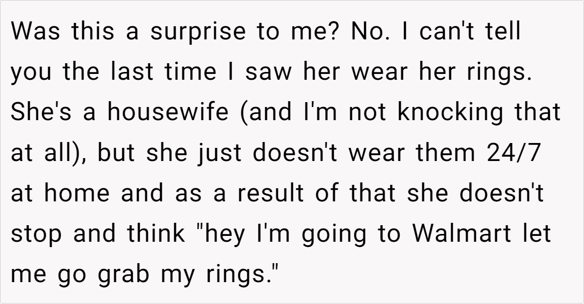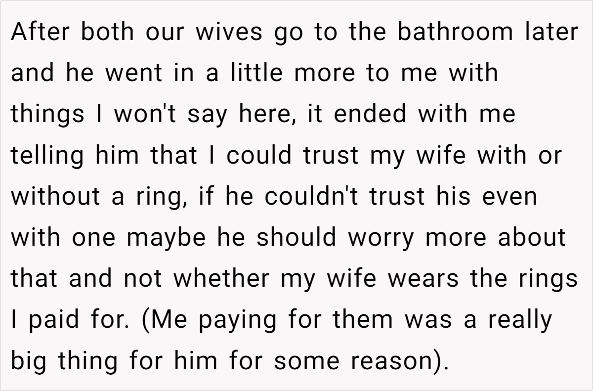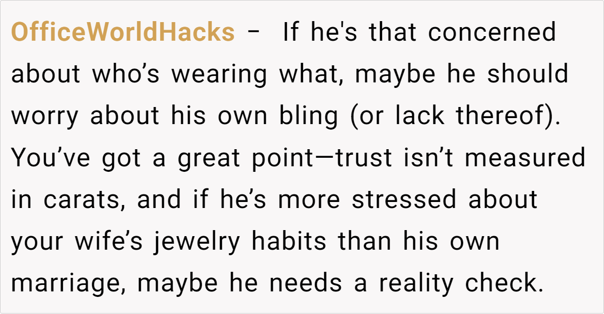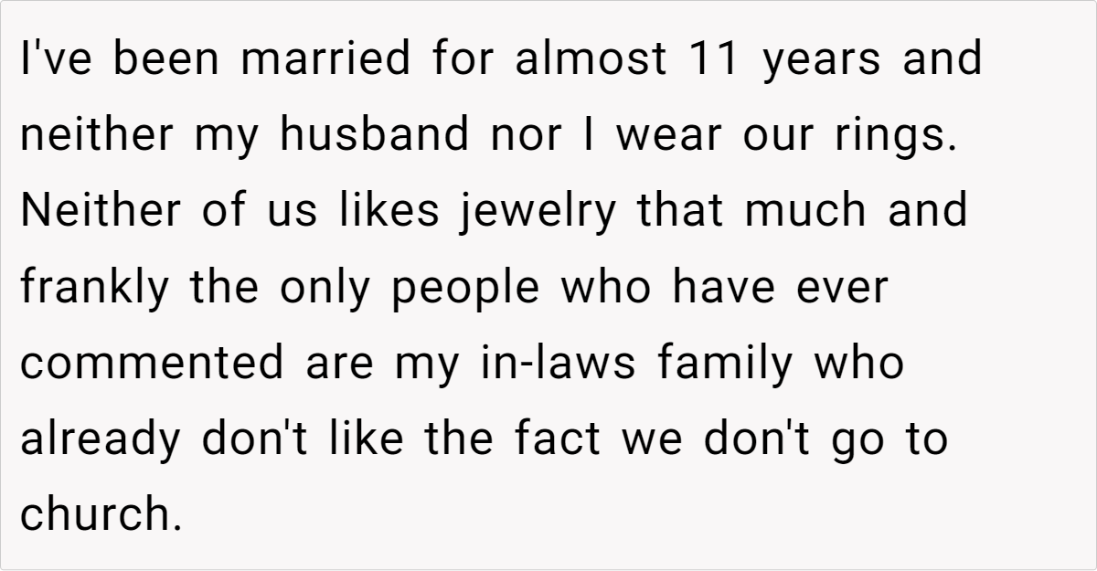 In this case, the brother-in-law’s criticism of OP’s wife for not wearing her wedding ring reflects his own values and beliefs about marriage, which may not align with OP and his wife’s. Dr. Gottman notes that “Each couple has their own unique way of expressing love and commitment, and it’s crucial for outsiders to respect those differences and avoid imposing their own judgments or expectations.” (Source: The Seven Principles for Making Marriage Work)
