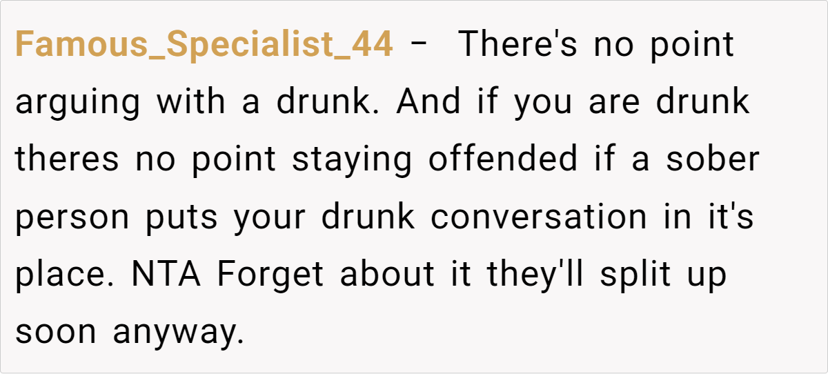 These are popular opinions on Reddit, but do they reflect reality? While some might argue that OP overreacted or could have handled the situation more diplomatically, it’s important to remember that protecting one’s partner and setting boundaries within family relationships is crucial for maintaining a healthy and respectful dynamic. The brother-in-law’s drunken behavior and his insensitive comments warranted a firm response, even if it led to temporary conflict.