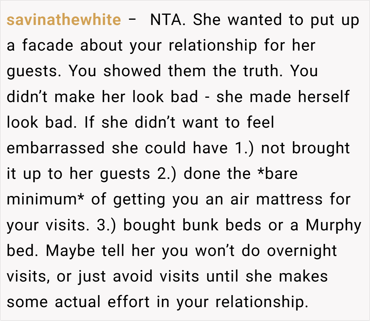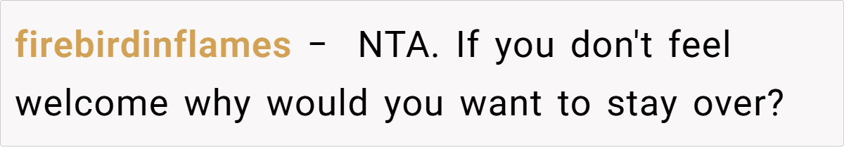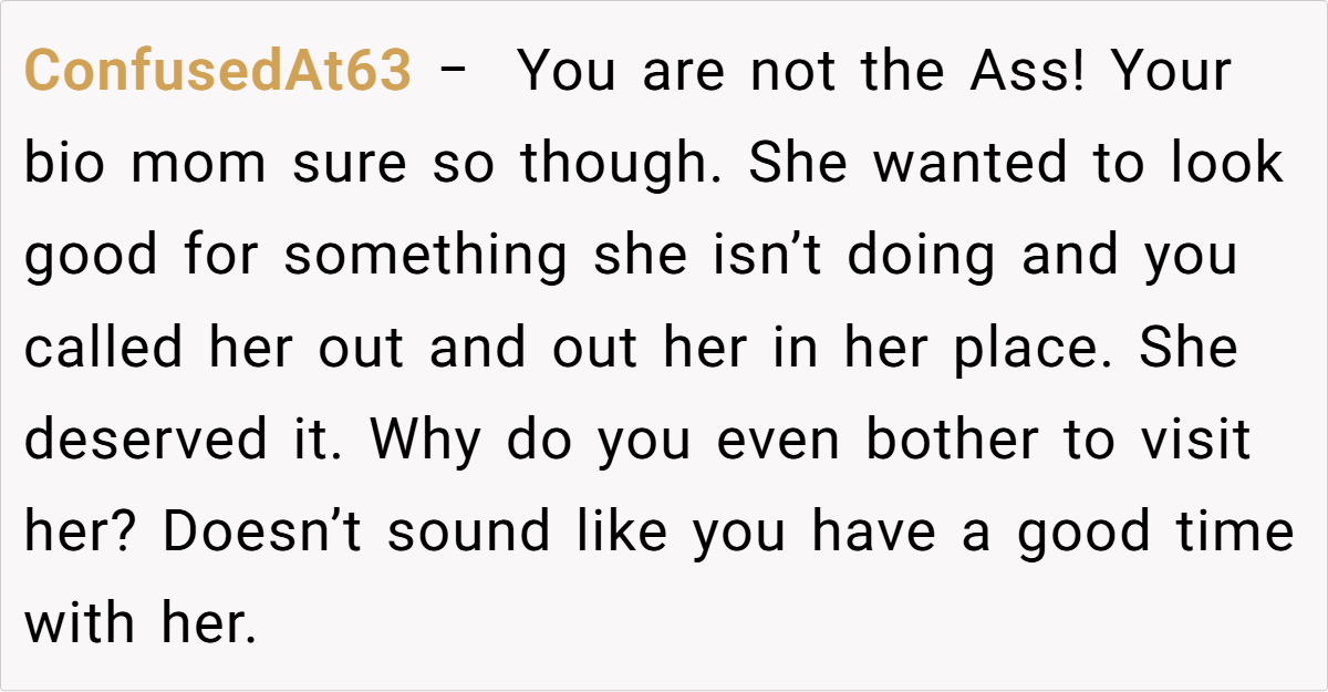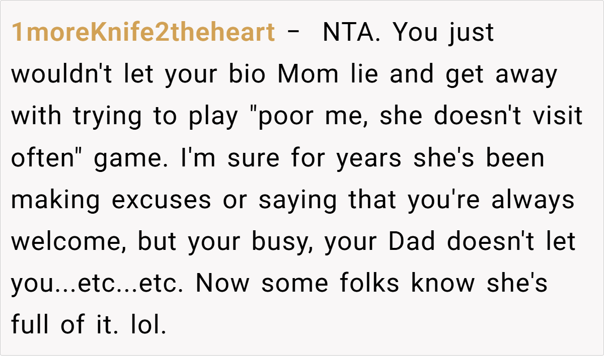 Many users express that if she truly wanted her daughter to visit, she would have made a proper effort rather than relying on superficial excuses. Some even suggest reconsidering the relationship altogether, given the ongoing lack of genuine care. Overall, the consensus is that the teen’s honesty about her living situation is justified, and she should not have to compromise her well-being to keep up appearances.