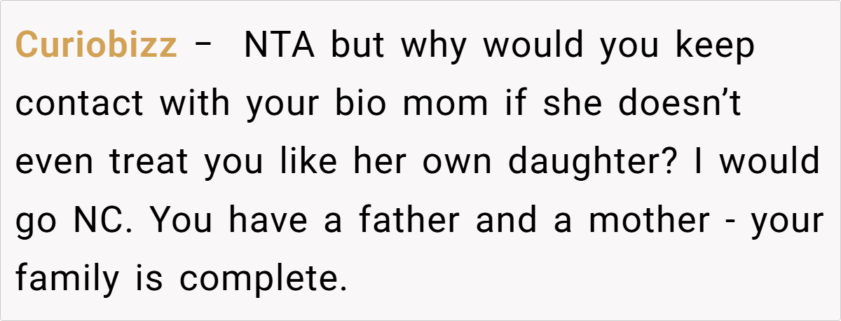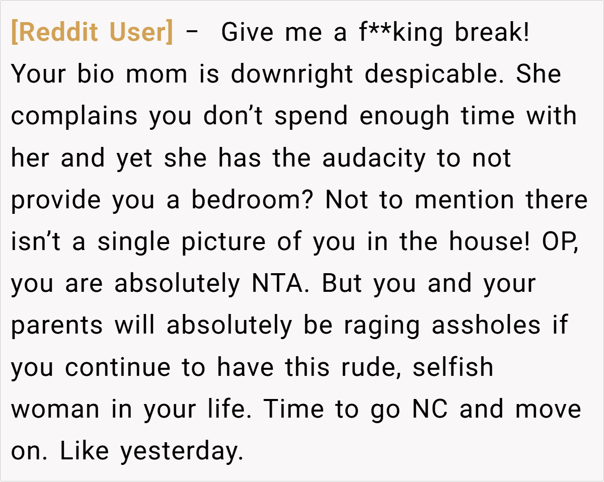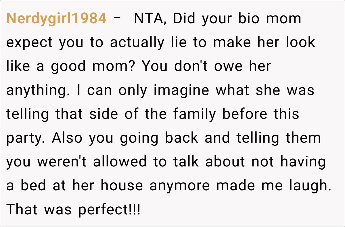 The Reddit community overwhelmingly agrees that the teen is not at fault (NTA). Commenters point out that the bio mom’s insistence on maintaining a perfect image—despite not providing basic accommodations like a bed—only exposes her own neglect.