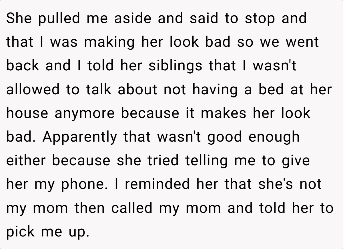 Experts argue that when caregivers neglect to provide even the simplest comforts for a child, it is only natural for that child to express hurt. “A child’s honest observation about not having a bed is not an act of rebellion but a genuine expression of feeling undervalued,” Dr. Markham adds. Instead of addressing these concerns directly and working to create a more inclusive environment, the bio mom’s attempt to gloss over the issue—by denying the teen’s reality and trying to control the narrative—only deepens the emotional divide.