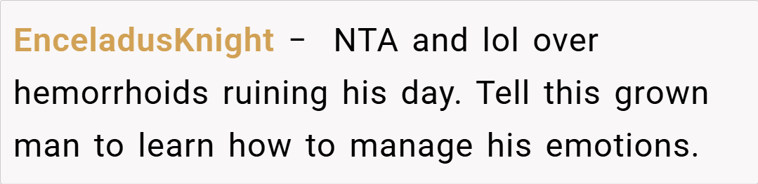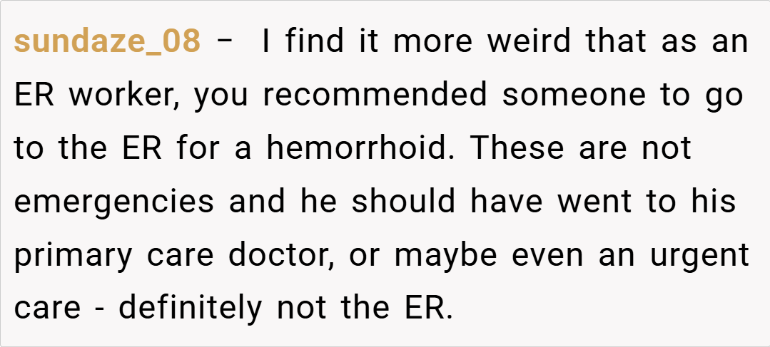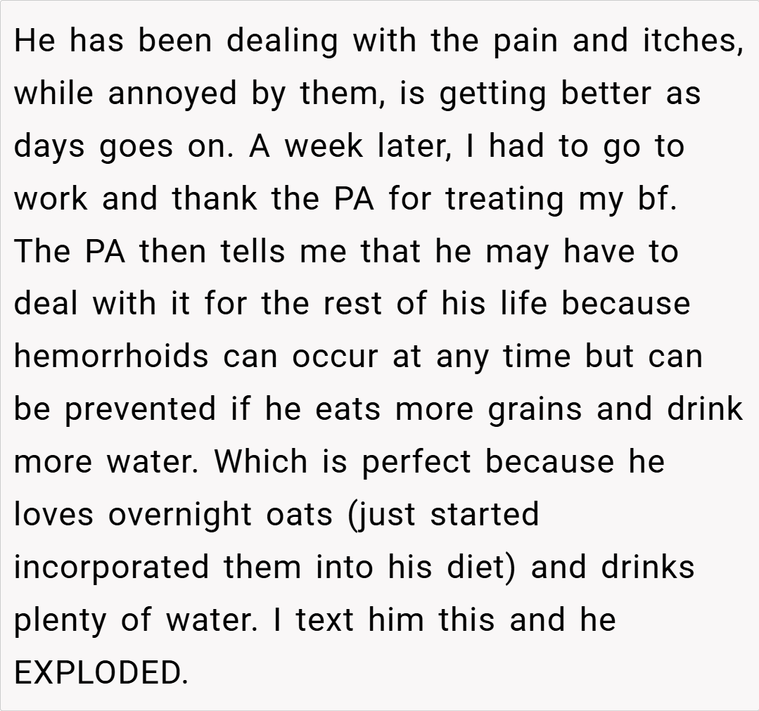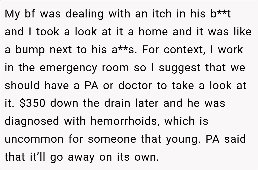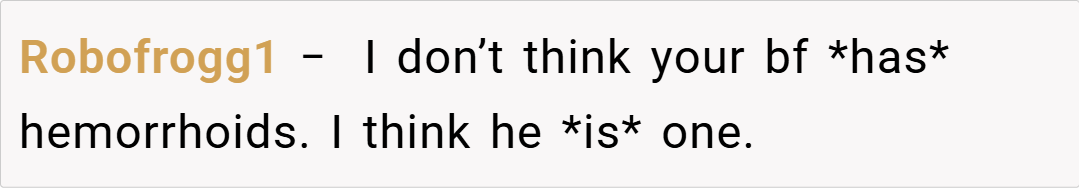 In the end, the OP’s decision to inform her boyfriend about the long-term nature of his hemorrhoids was intended as a straightforward, medically sound piece of advice—a reflection of her professional background. While her delivery may have come off as unsympathetic given his fragile peace, many agree that the issue at hand is minor in the grand scheme of things. However, if you’re sensitive about your personal comfort, even small inconveniences can feel overwhelming.