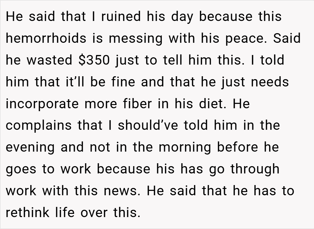 concerned about his well-being (and admittedly, accustomed to seeing worse in the ER), texted him a message outlining that he needed to deal with this condition and incorporate more fiber into his diet. Instead of taking the advice in stride, he exploded, claiming that she ruined his day and that he felt his peace was shattered. Now, feeling hurt by his reaction and his dismissive attitude, she wonders if she’s in the wrong for bluntly stating the reality of his condition without any sympathy.