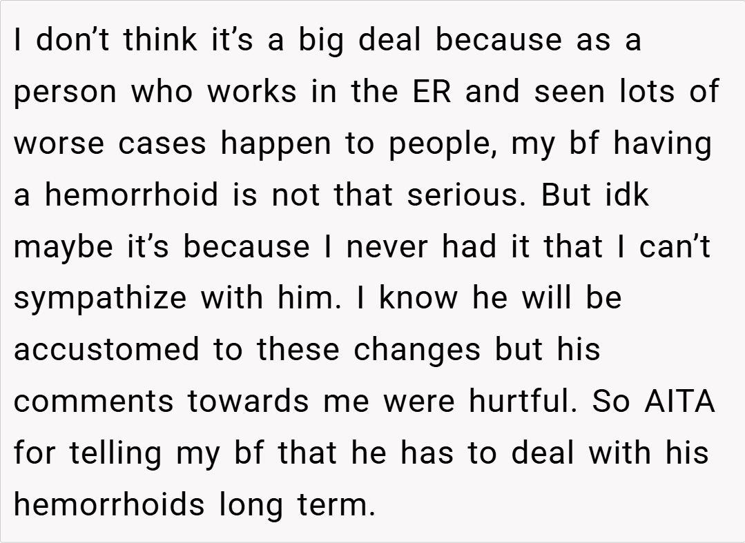 When minor health issues become flashpoints for deeper emotional responses, it’s hard not to question whether our reactions are justified. Our OP, a 25‑year‑old ER professional, shares how a routine check on her 26‑year‑old boyfriend’s leg and hip complications turned into a contentious moment. After he underwent surgery that left him with painful hemorrhoids—a condition that may persist long term despite dietary adjustments—the OP,