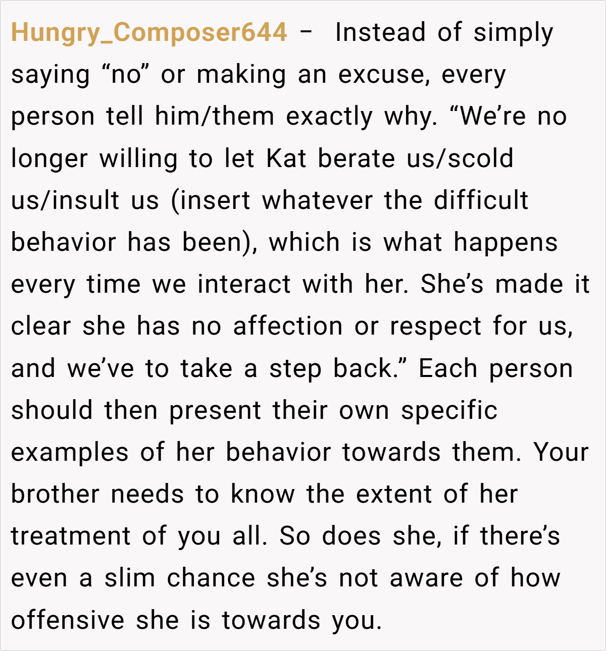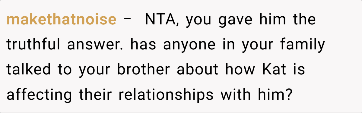 In light of this, my decision to call out Kat wasn’t made in a moment of anger but rather as a culmination of many instances where her actions have negatively affected our relationships. The intent was not to alienate my brother, but to highlight that his frustration might be misdirected. Instead of blaming our mother—who has consistently tried to avoid conflict—I believed it was time for him to recognize that Kat’s behavior is the common denominator behind the drama.