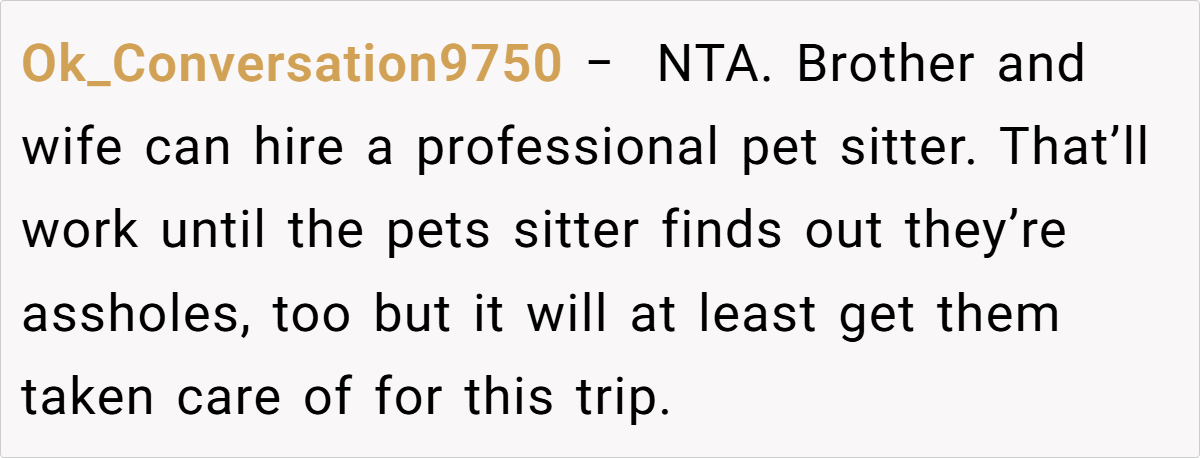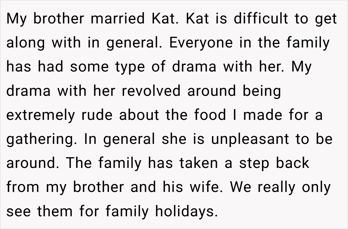 The ongoing tension in this family appears to stem from Kat’s recurring behavior—rudeness, dismissiveness, and an overall lack of respect for the established norms and feelings of other family members. When my brother recently recounted his frustrations about our mother’s reluctance to help with pet-sitting, it was clear that the real problem was a pattern of behavior that many in the family have grown weary of.