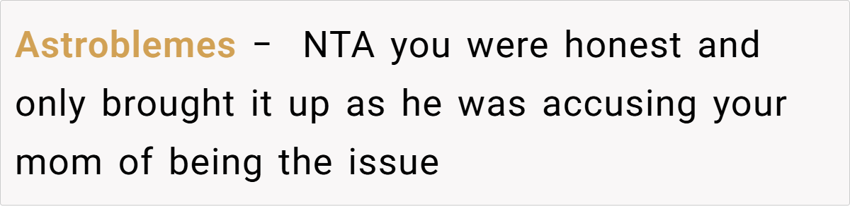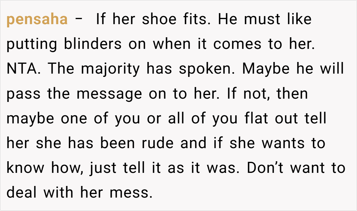 The majority of commenters agreed with the writer’s view, asserting that the mother was not the source of the family conflicts; rather, it was Kat, the brother’s wife, who was the common denominator in all the drama. Commenters felt that the writer was honest in highlighting Kat’s negative behavior and suggested that providing more specific examples could help the brother understand the full impact of her actions. Overall, the community supported the writer’s decision to set boundaries and advocate for honest communication within the family, though a few noted that the writer’s approach was somewhat blunt.