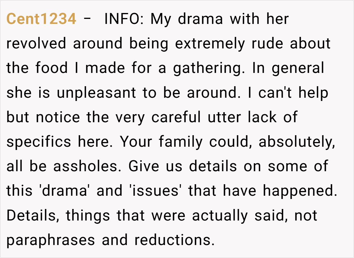 Each incident, whether it was her derogatory comments about food at gatherings or her general attitude, has contributed to a buildup of resentment. According to relationship expert Dr. John Gottman, “When one person repeatedly disrupts the harmony of family interactions, it’s crucial to address not only the behavior but also the impact it has on everyone involved.”