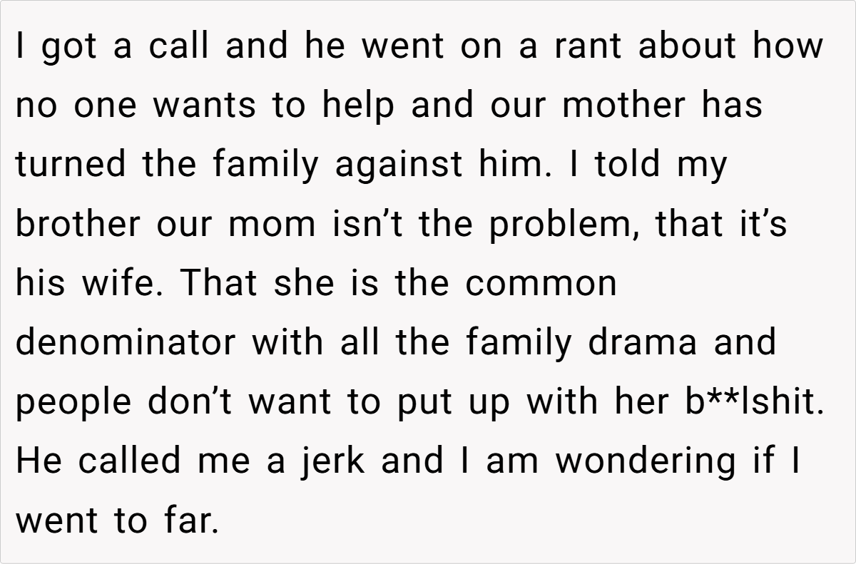 ‘AITA for telling my brother our mother isn’t the problem, his wife is the common denominator with all this drama?’