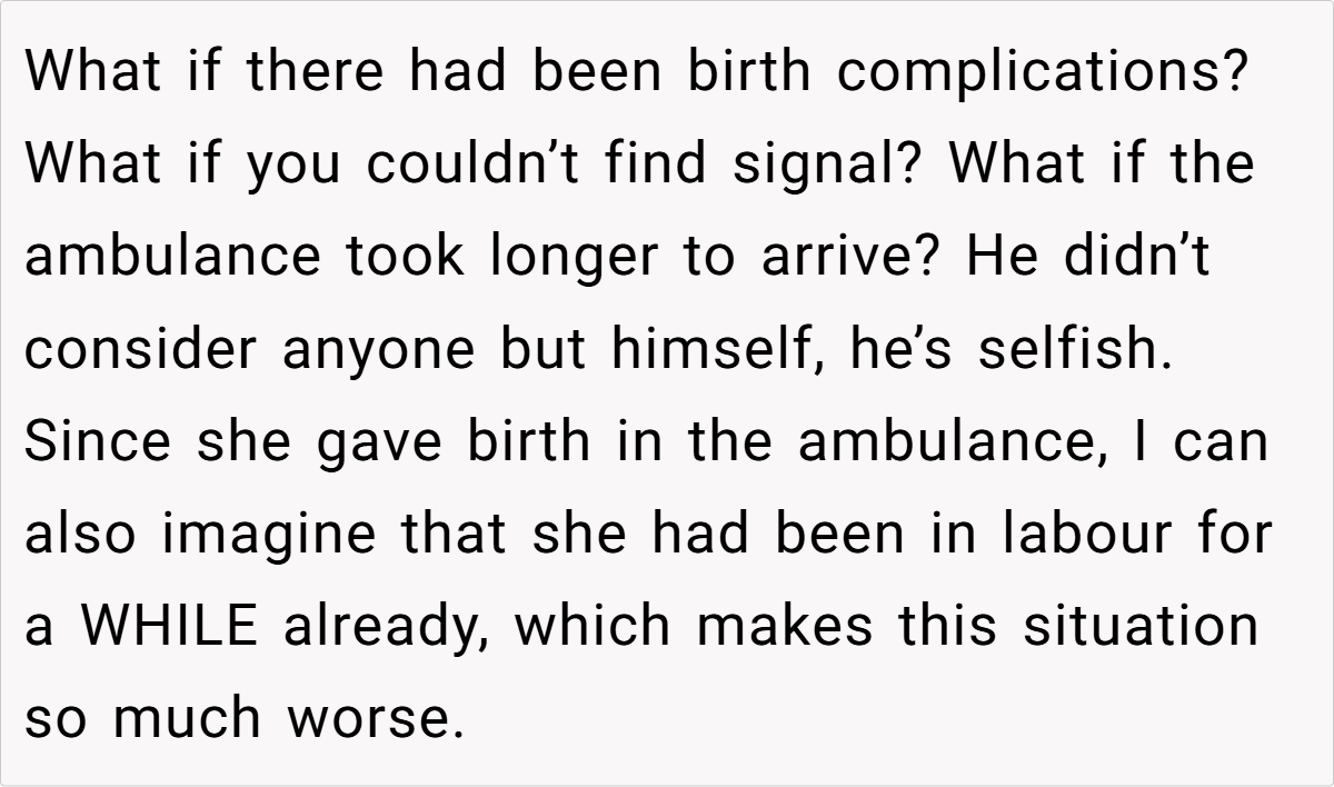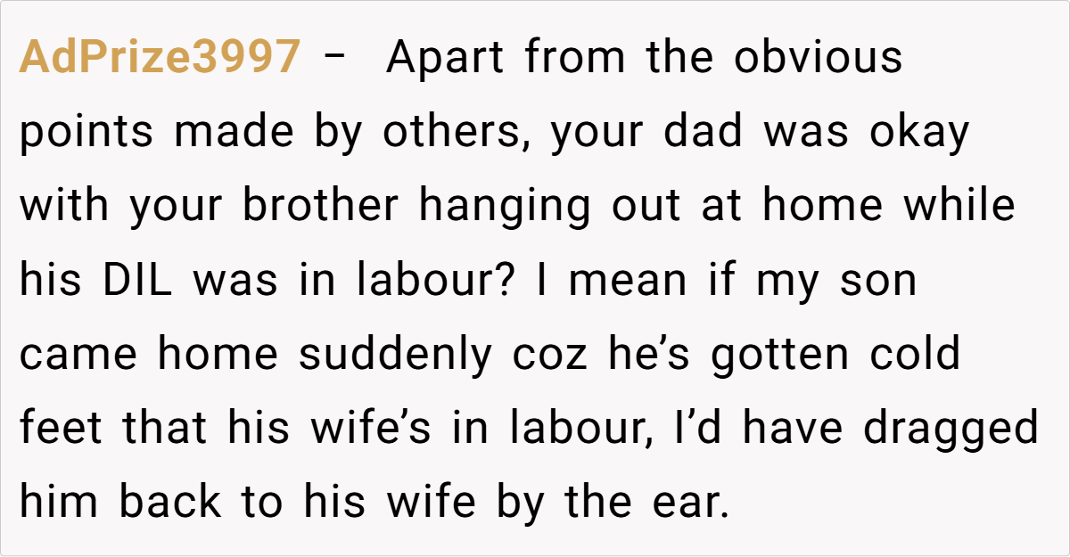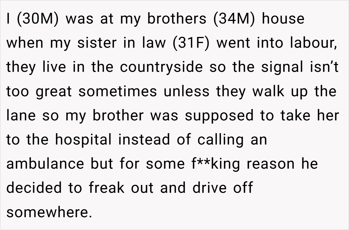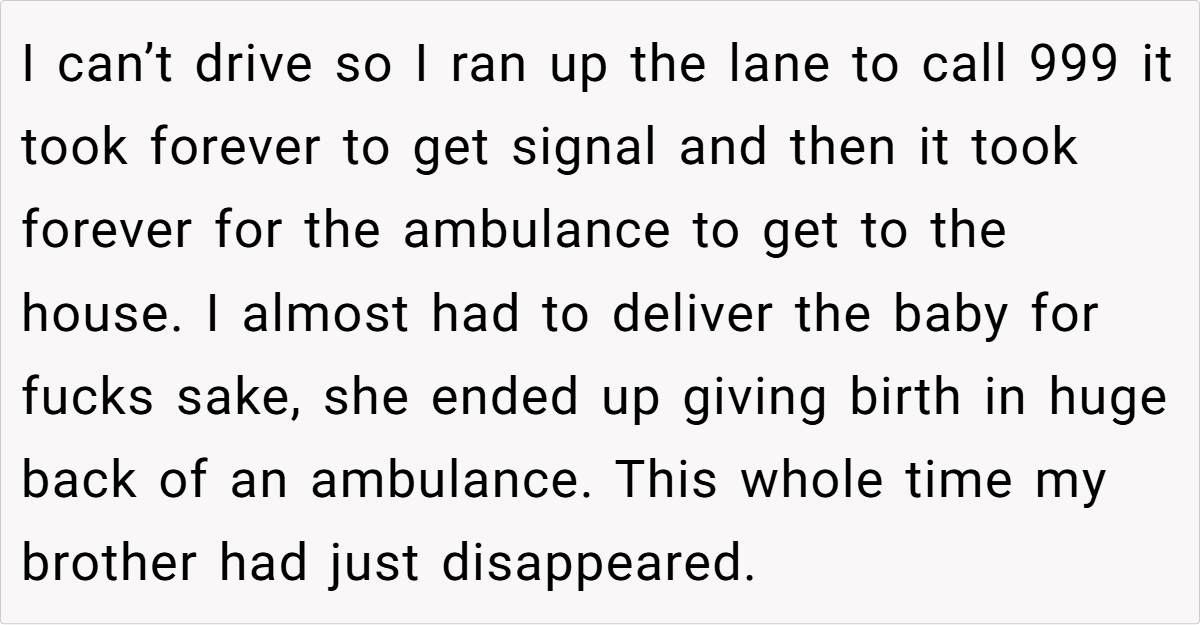 With no one else able to drive, the OP sprinted up the lane to call 999, enduring delays in signal and response, and almost ended up delivering the baby in the back of an ambulance. The chaos left him fuming, and in a moment of heated frustration, he told his brother that if this behavior continued, he was going to be a “shit dad.”