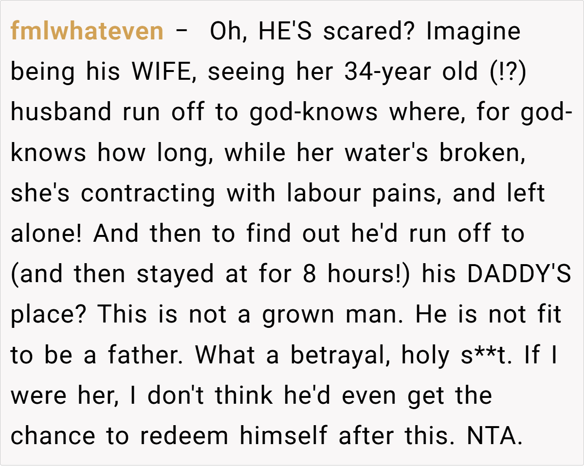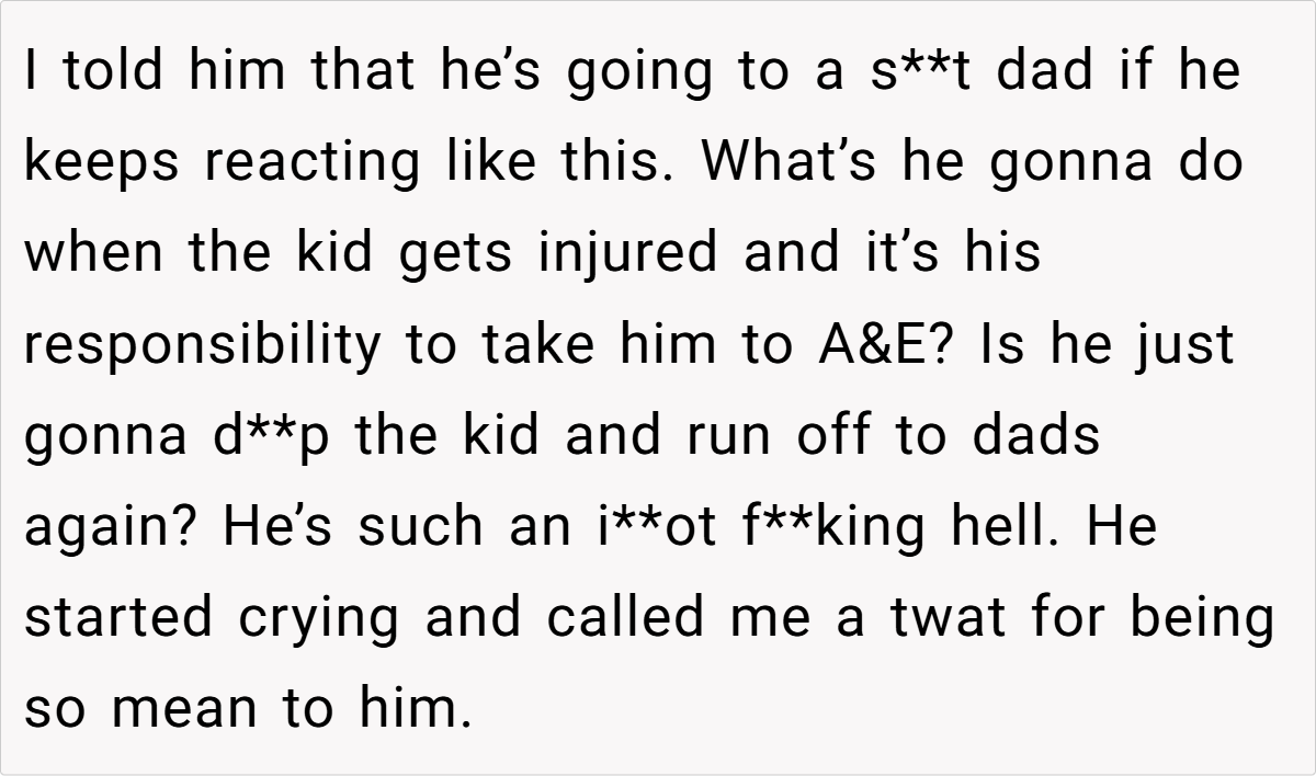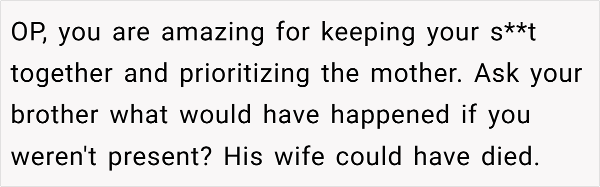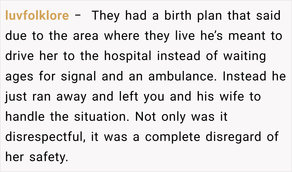 With no one else able to drive, the OP sprinted up the lane to call 999, enduring delays in signal and response, and almost ended up delivering the baby in the back of an ambulance. The chaos left him fuming, and in a moment of heated frustration, he told his brother that if this behavior continued, he was going to be a “shit dad.”