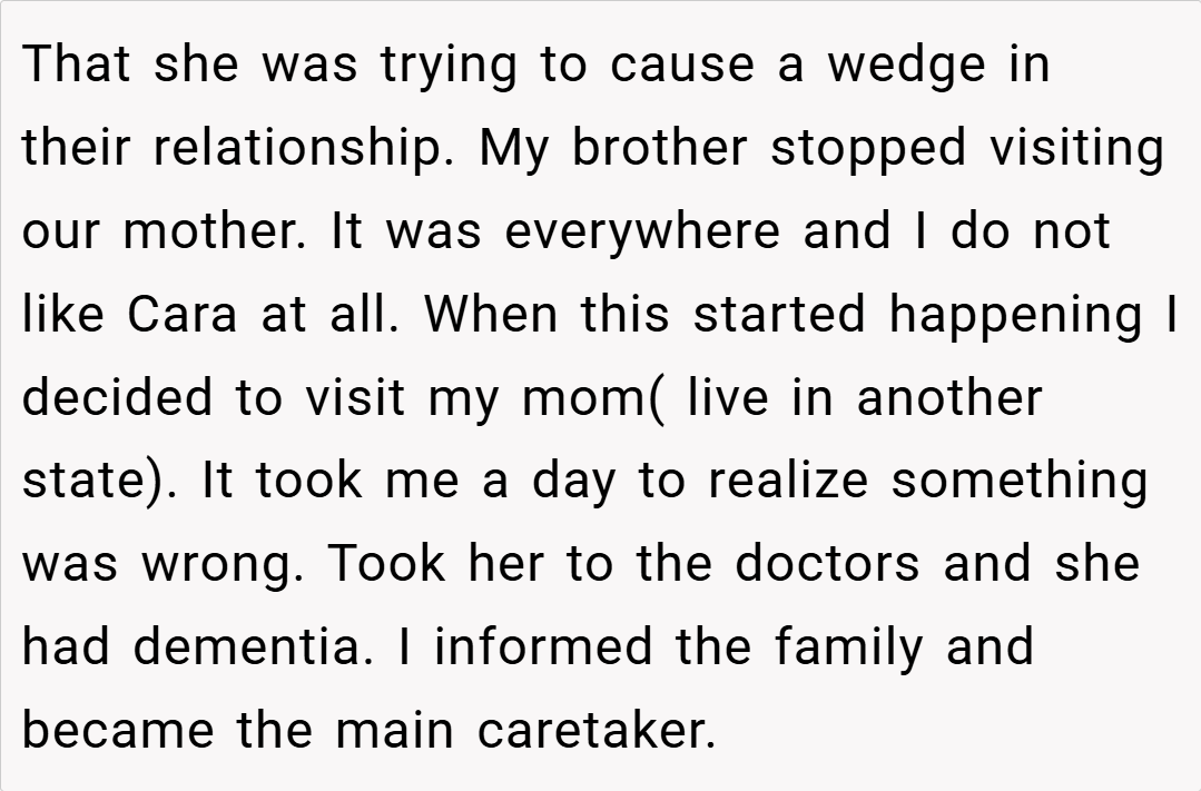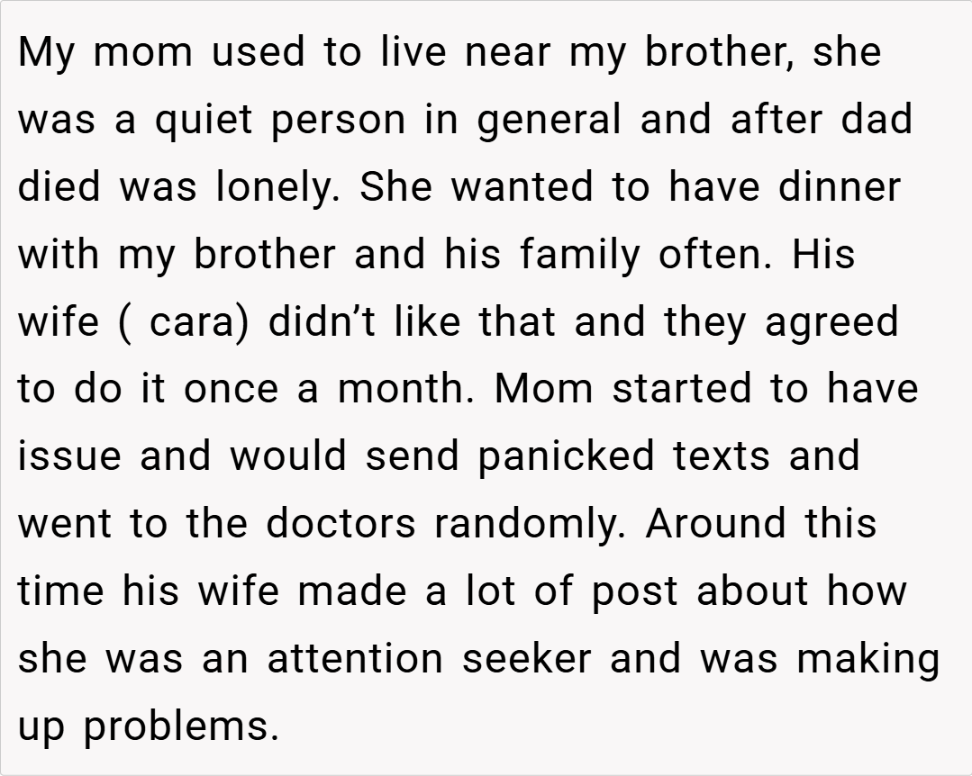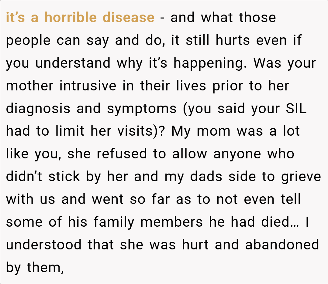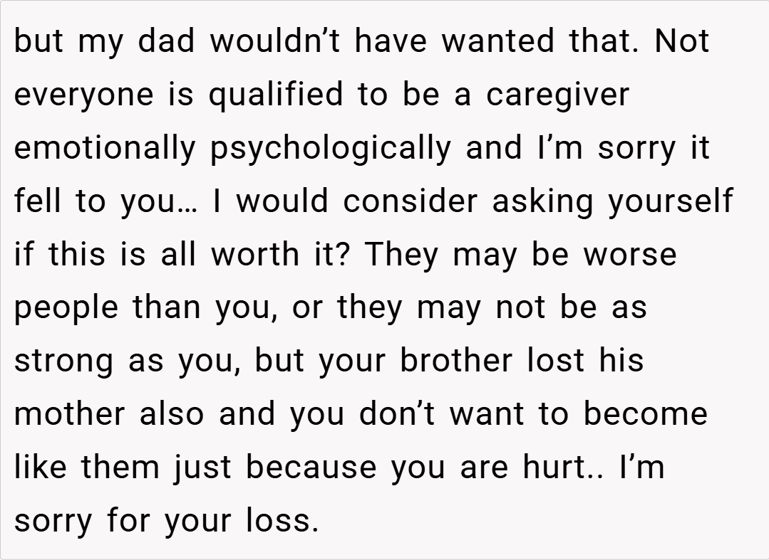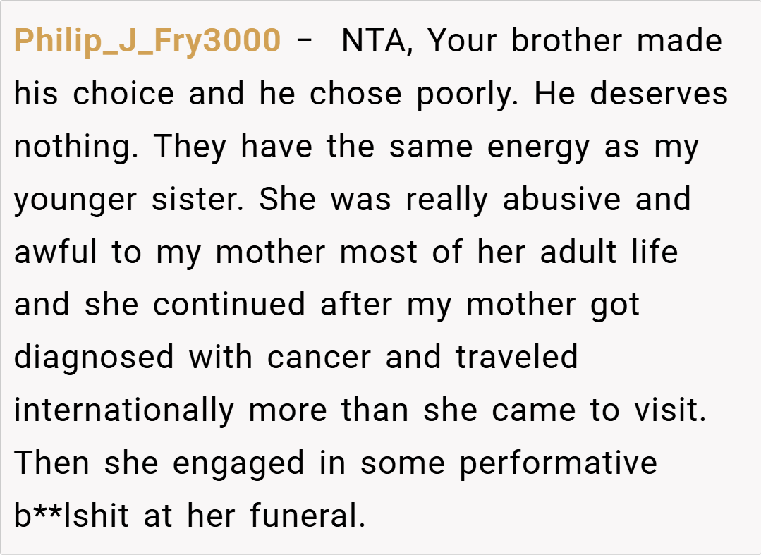 After becoming the primary caretaker when their mother was diagnosed with dementia, the responsibility of honoring her memory fell squarely on their shoulders. Despite pleading with her brother to spend time with their mom during her final days, he chose not to, leaving a lasting wound on the family dynamic.
