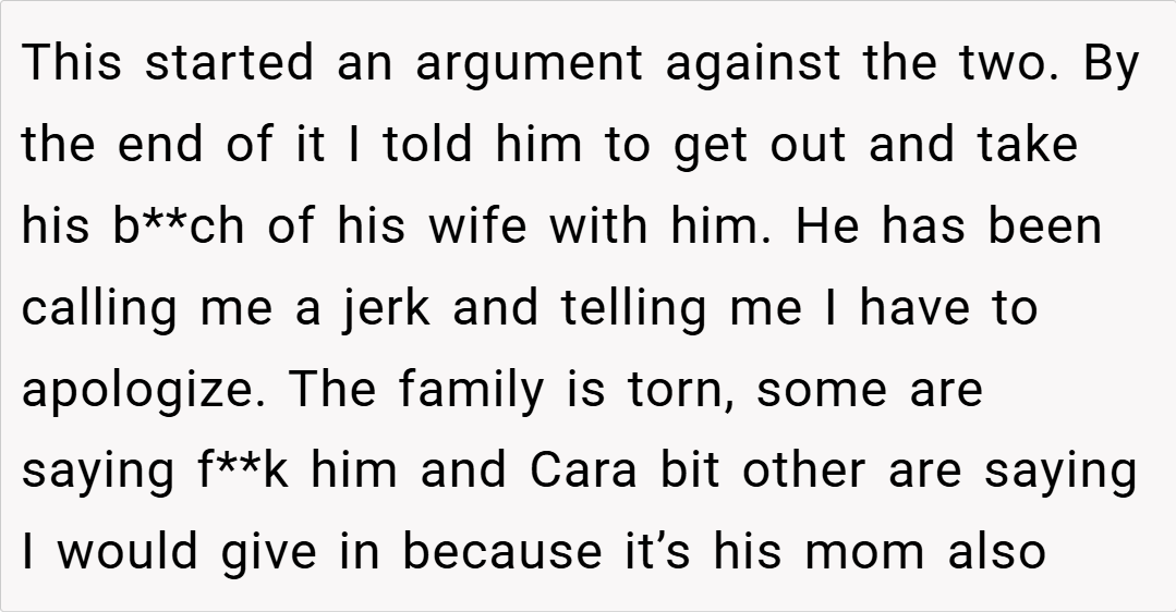Matters worsened when, after the cremation, the brother and his wife—whom the storyteller holds in deep contempt—showed up demanding some of their mother’s ashes. In a moment of unfiltered frustration, the storyteller told him to get out and take his wife with him. This stark declaration ignited a fierce argument, leaving family members divided over whether this reaction was justified or an overstep.